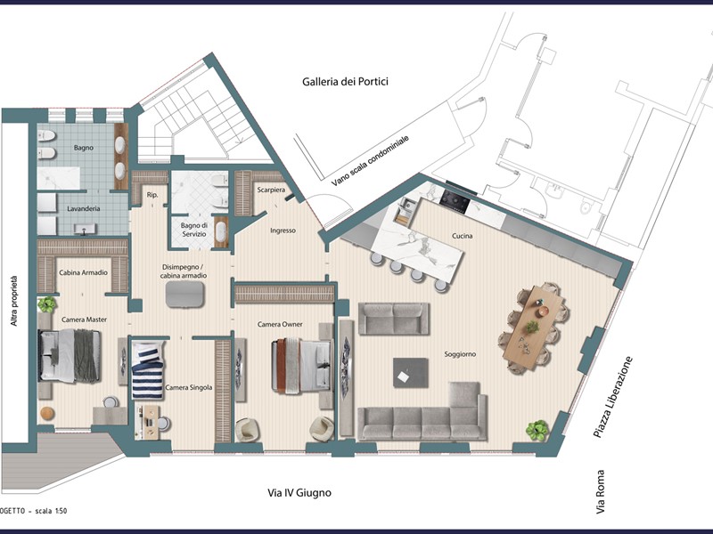 L'unità può essere trasformata in residenza costituita da: ingresso di rappresentanza che introduce nella spettacolare zona giorno di oltre 70 mq che integra cucina, sala da pranzo e soggiorno in un unico ambiente a pianta libera con affacci scenografici sulla piazza centrale. La zona notte si sviluppa in una configurazione razionale e funzionale composta da una camera padronale con affaccio su via Roma con annessa cabina armadio, una camera doppia master molta ampia, una camera singola riservata, due bagni (uno principale e uno per ospiti), una lavanderia, un guardaroba-disimpegno centrale da oltre 10 mq, un ripostiglio, una cappotterà e una scarpiera separate. L'abitazione, viene venduta allo stato attuale, come vista in foto.