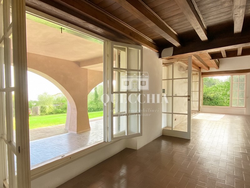 All'esterno portico scorcio lago, giardino con piscina e due posti auto coperti.