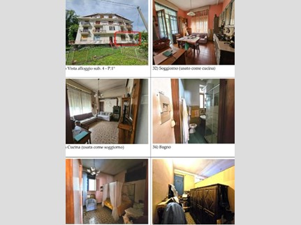Bene 4: Piena ed intera proprietà dell’unità immobiliare a destinazione d’uso residenziale (appartamento) al piano primo, composto da: soggiorno, cucina, due camere, disimpegno, servizio igienico, locali esterni ad uso ripostiglio e tratto di balcone.