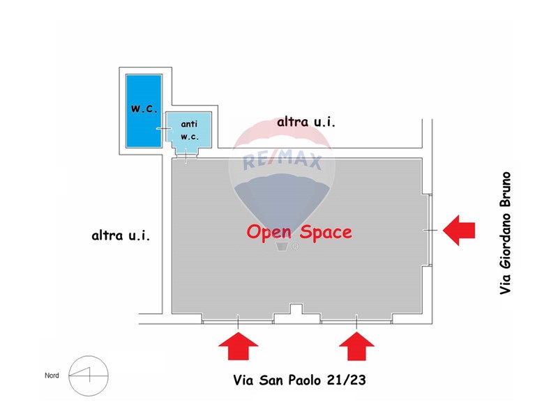 - locale al piano terra, ad angolo tra Via Giordano Bruno e Via San Paolo, composto da un unico ambiente OPEN SPACE di circa 37 mq., oltre bagno ed antibagno, e con tre aperture, di cui una su Via G.no Bruno ed altre due su Via San Paolo;