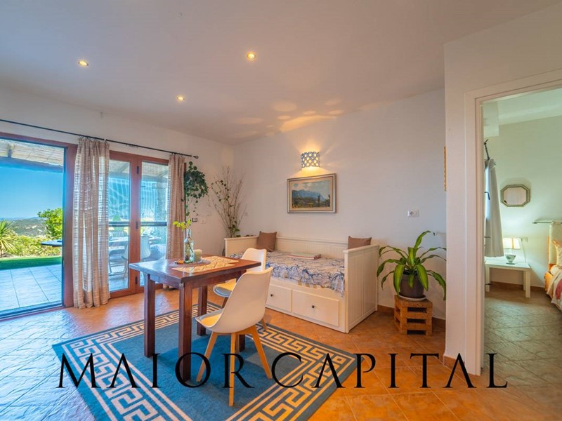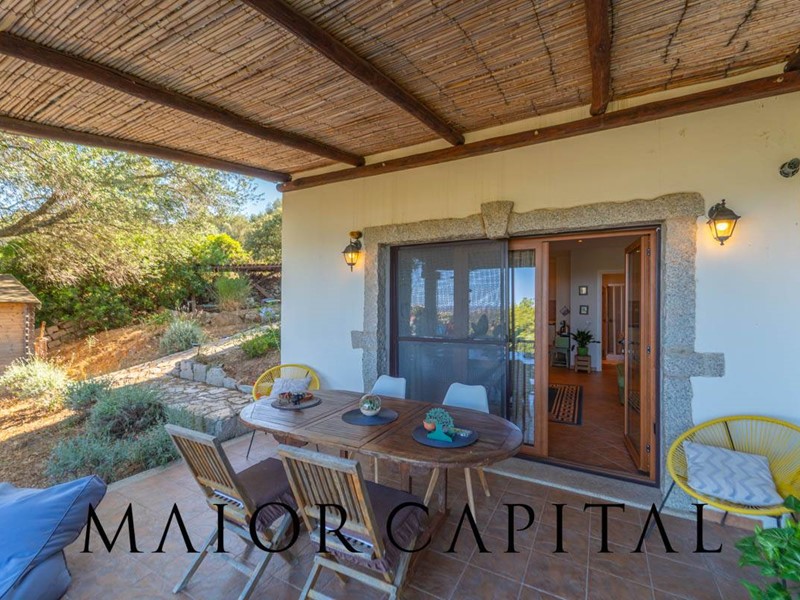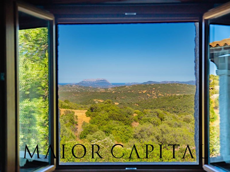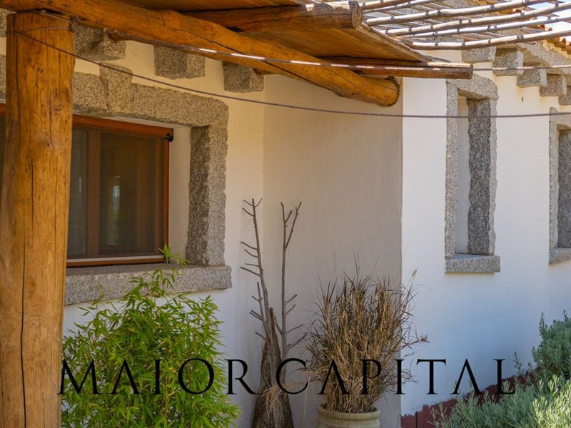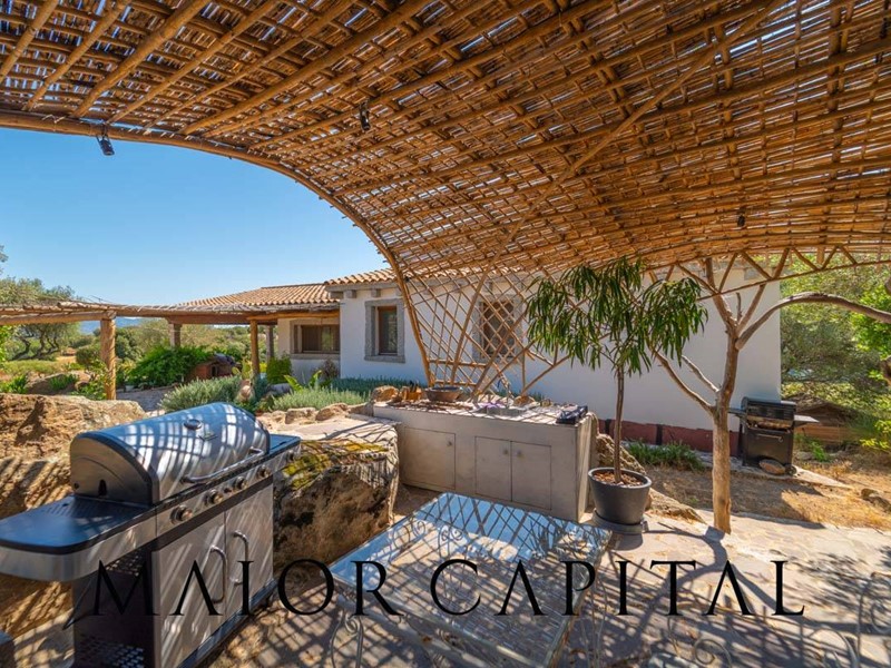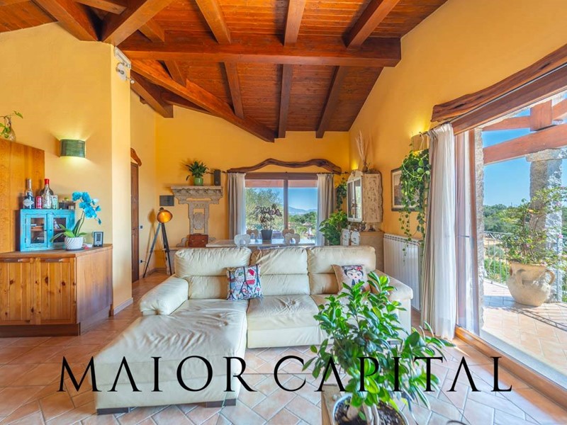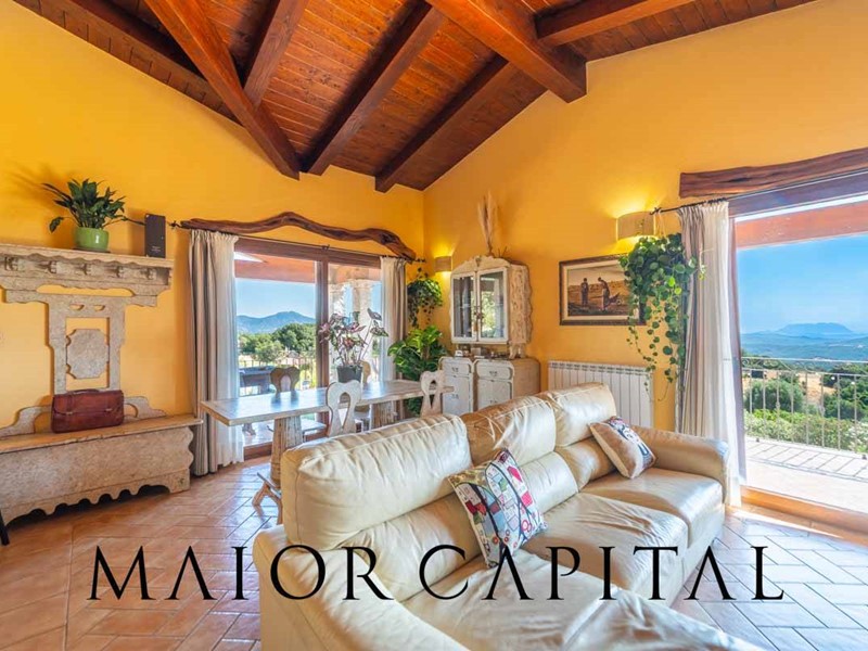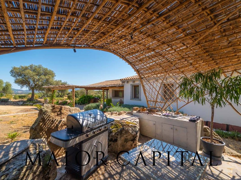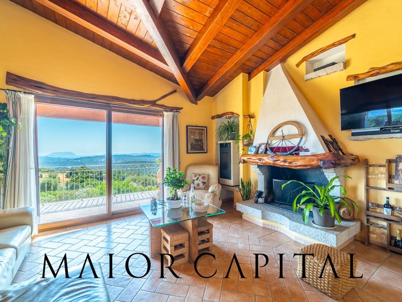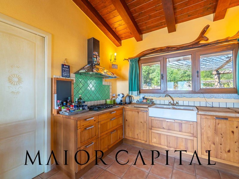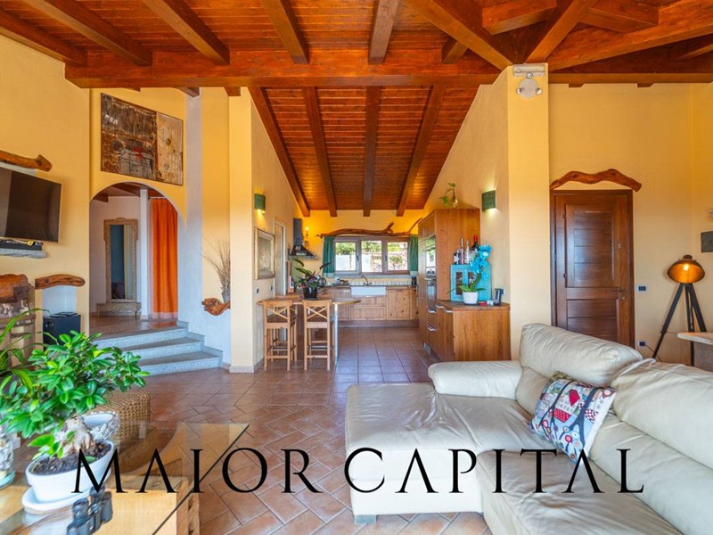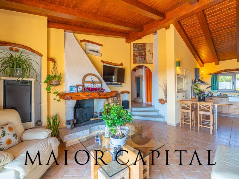 La villa si articola su due livelli e si accede al piano principale attraverso una suggestiva veranda con vista sul mare e sullisola di Tavolara. Lingresso si apre con una zona living caratterizzata da soffitto a travi in legno scuro che conferisce un tocco rustico e caldo allambiente, mentre i dettagli in pietra e legno, come il camino, i toni caldi delle pareti e dei pavimenti contribuiscono a rendere l'ambiente ancora più accogliente dandogli uno stile boho-chic. La cucina a vista dallo stile rustico, presenta arredi in legno. Il piano cottura, con ampi spazi di lavoro, è affiancato da una finestra che si affaccia sul giardino, portando luce naturale e una piacevole sensazione di apertura verso l'esterno.
