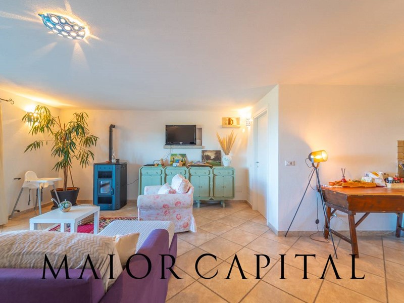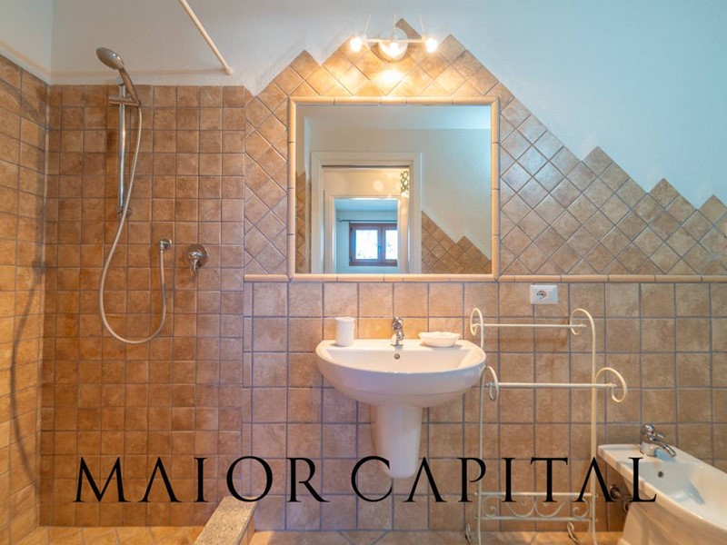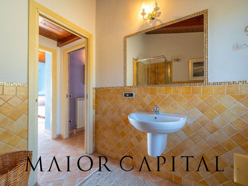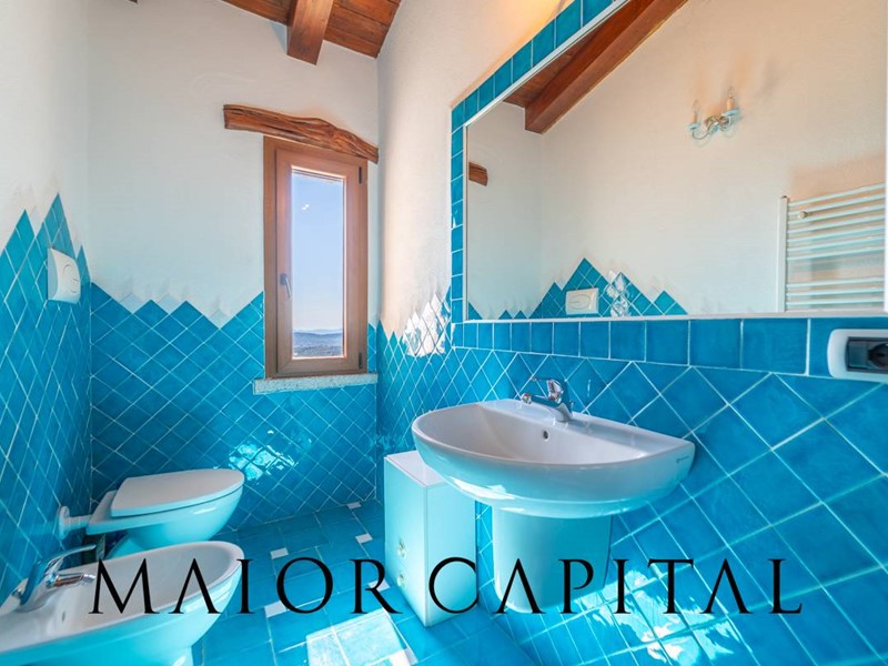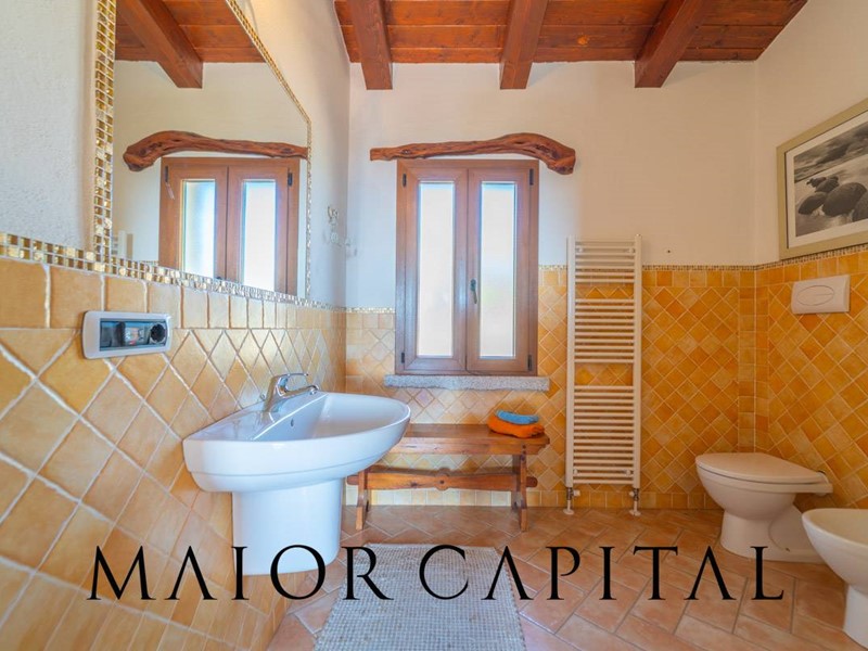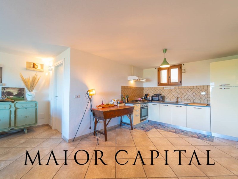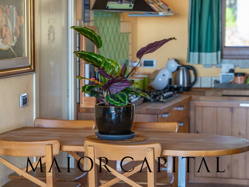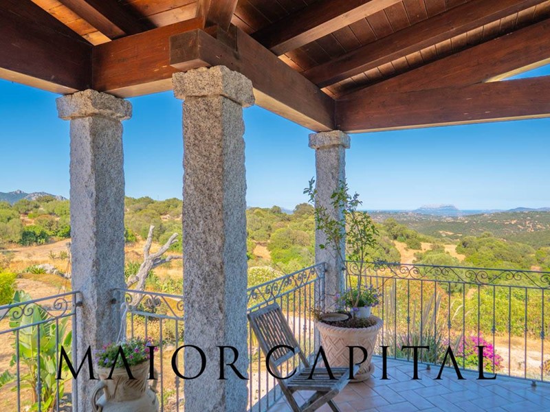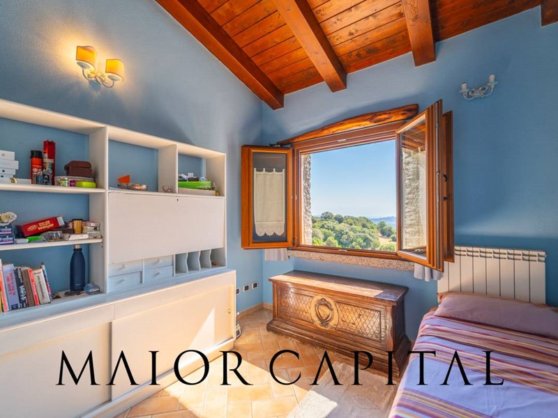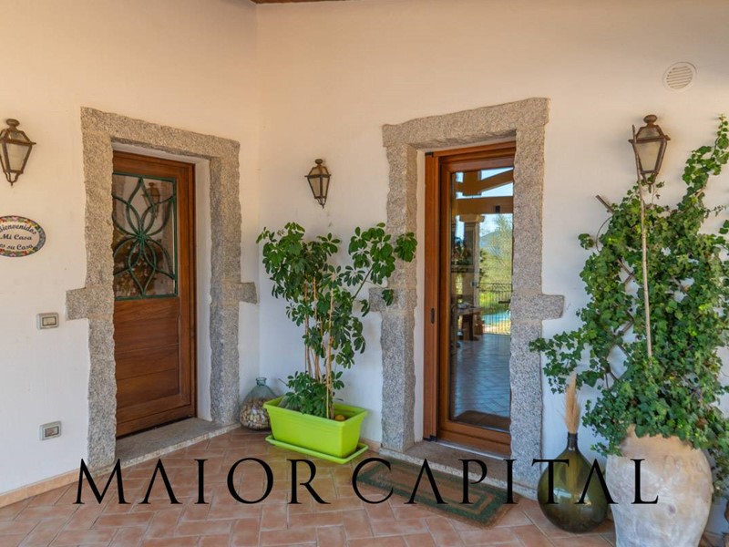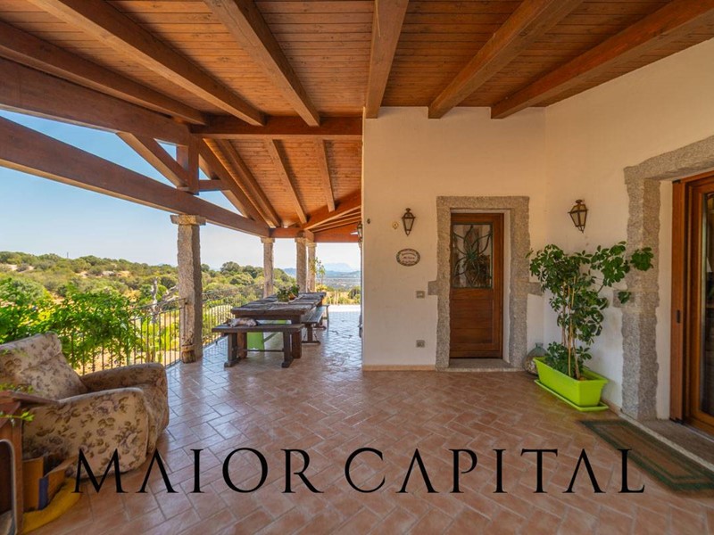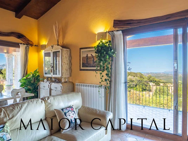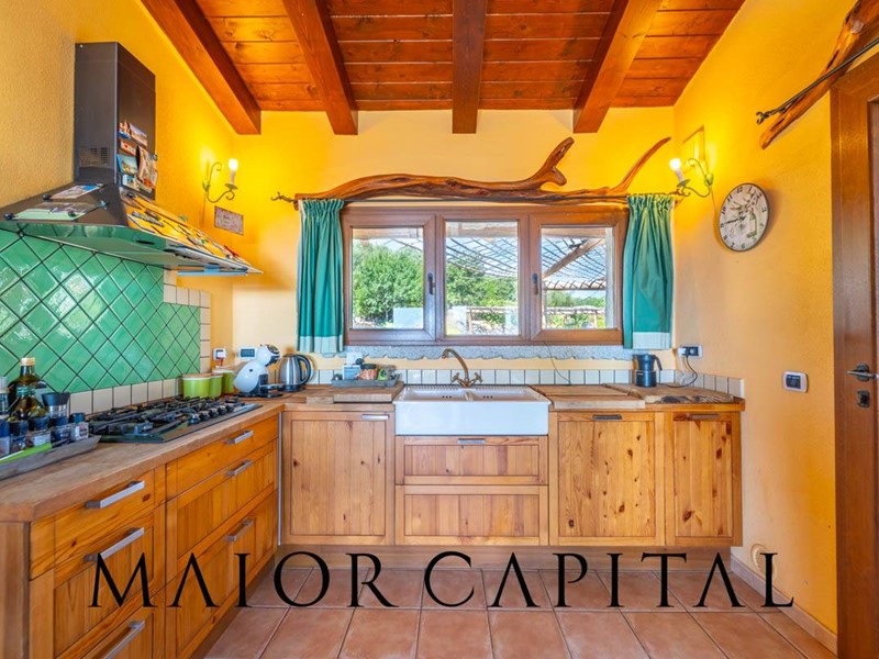 La villa si articola su due livelli e si accede al piano principale attraverso una suggestiva veranda con vista sul mare e sullisola di Tavolara. Lingresso si apre con una zona living caratterizzata da soffitto a travi in legno scuro che conferisce un tocco rustico e caldo allambiente, mentre i dettagli in pietra e legno, come il camino, i toni caldi delle pareti e dei pavimenti contribuiscono a rendere l'ambiente ancora più accogliente dandogli uno stile boho-chic. La cucina a vista dallo stile rustico, presenta arredi in legno. Il piano cottura, con ampi spazi di lavoro, è affiancato da una finestra che si affaccia sul giardino, portando luce naturale e una piacevole sensazione di apertura verso l'esterno.