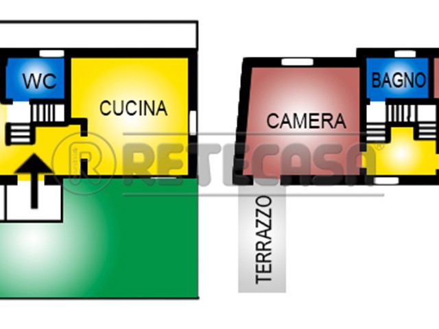 Al piano terra troviamo l’ingresso, la cucina separata dal soggiorno con accesso al terrazzo e un bagno con finestra.