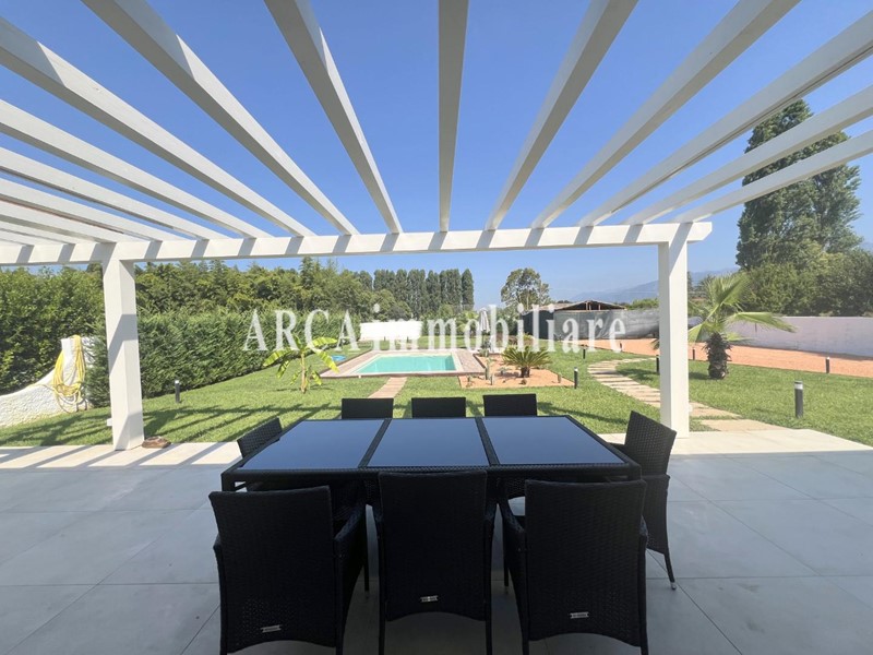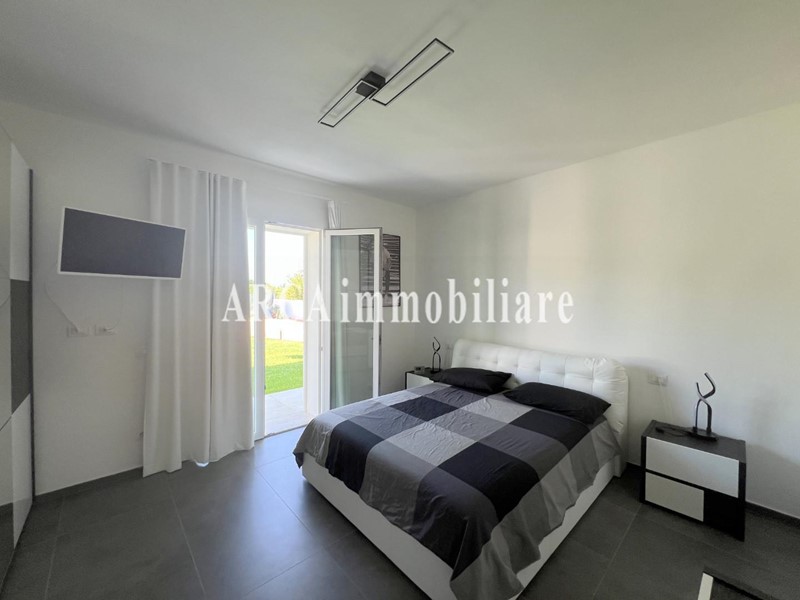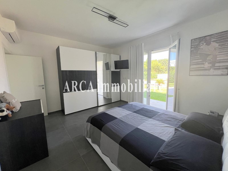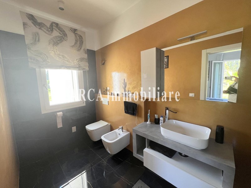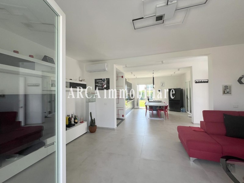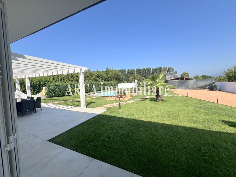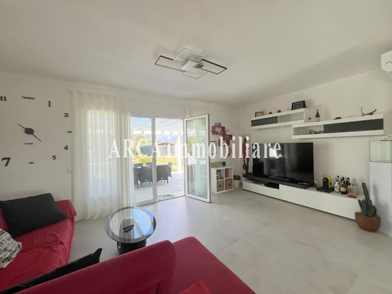 dal soggiorno), con varie aperture tra cui una a vetro sul grande pergolato, bagno, 3 camere, ciascuna delle quali ha accesso diretto nel giardino e di cui una con grande bagno privato, locale termo. Riscaldamento a pavimento, impianto fotovoltaico.