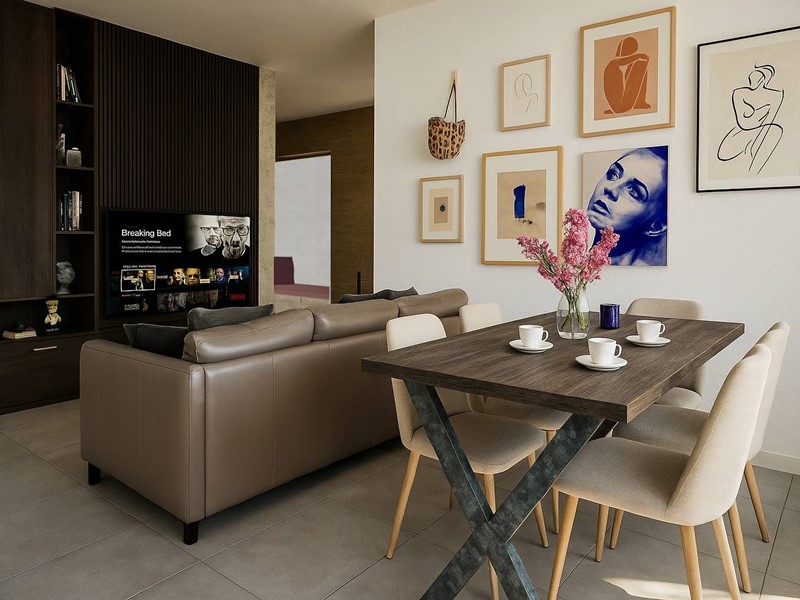 Zona living spaziosa e moderna, perfetta per accogliere amici o semplicemente rilassarsi in un ambiente arioso e pieno di luce naturale.