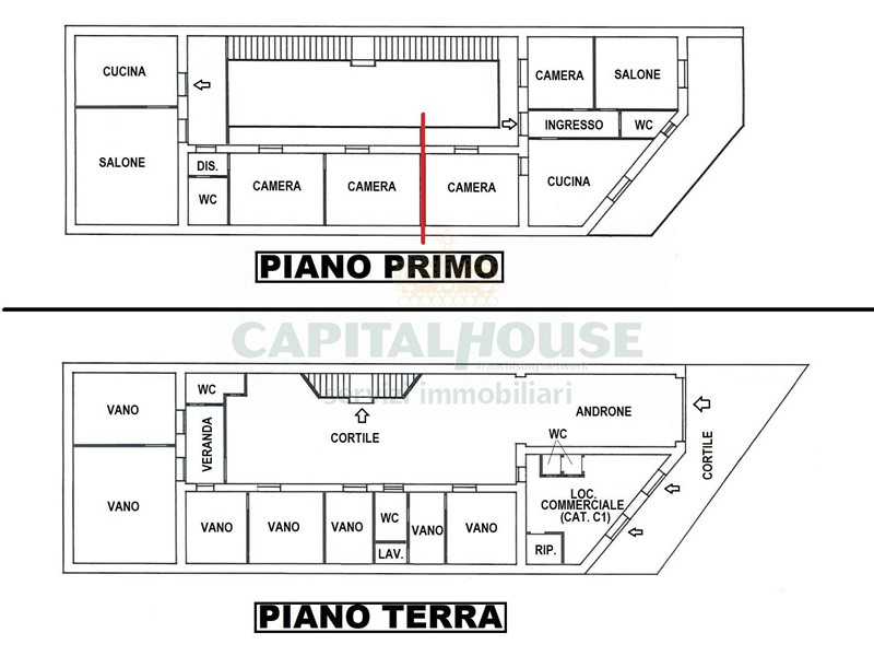 -piano terra: negozio cat. C1 fronte strada da 45mq + cortile di 160mq + vari vani ad uso depositi per 135mq;