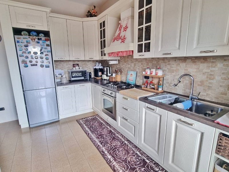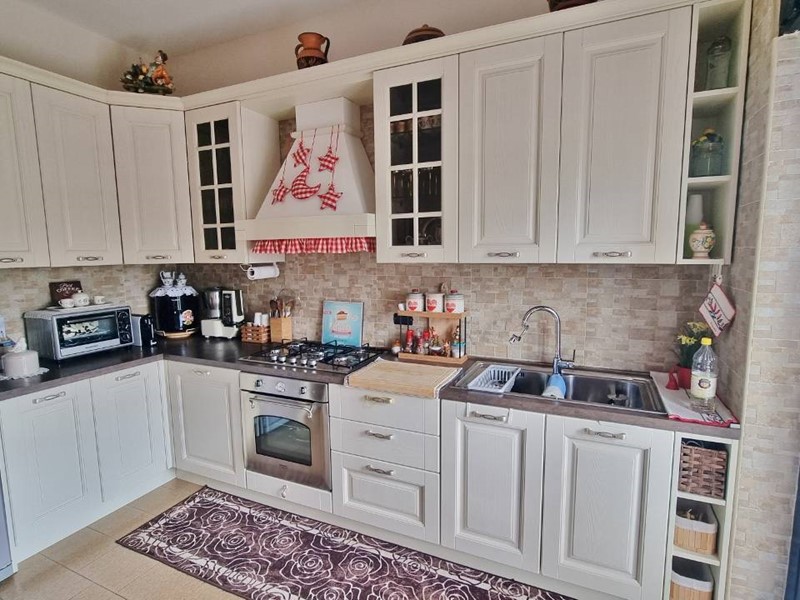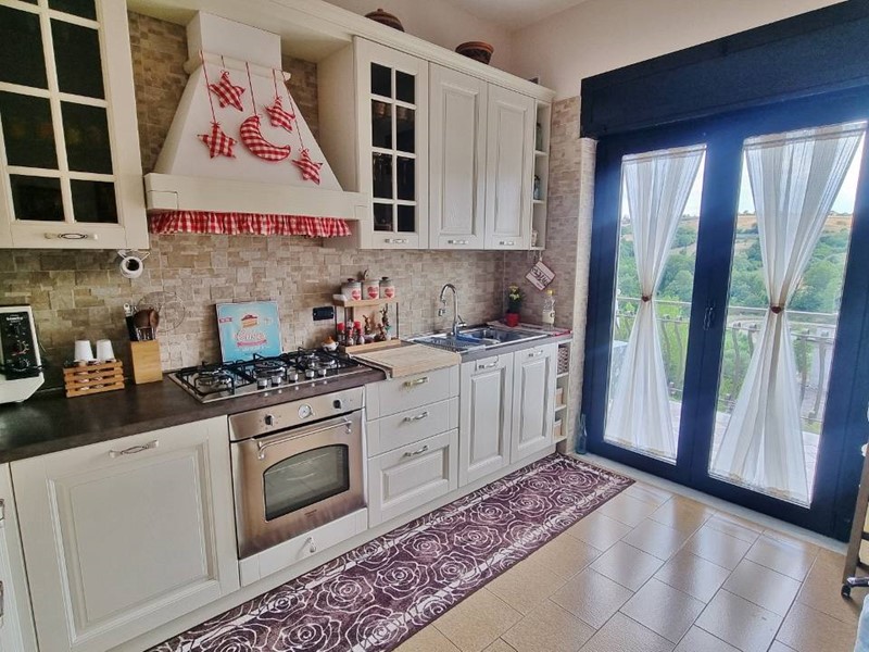 L'ingresso principale si apre su un ampio e luminoso salone, cucina abitabile che si affaccia su un balcone dalla vista panoramica è separata dalla zona giorno da un'elegante porta a scrigno.