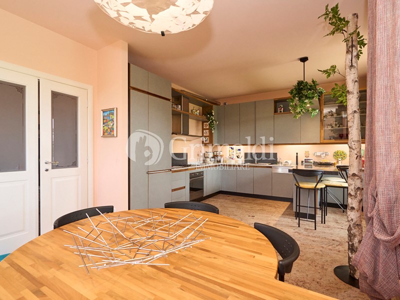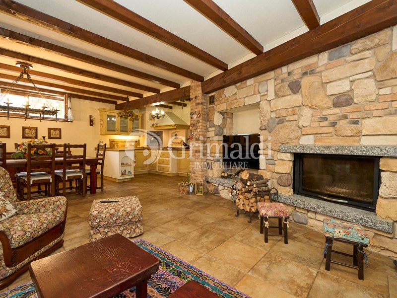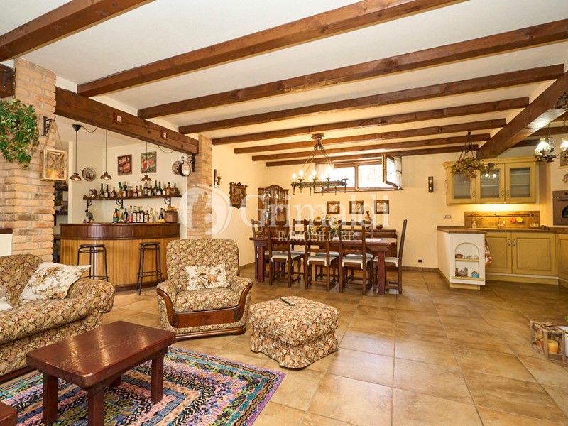 Al centro della stanza si trova un ampio tavolo in legno massiccio, ideale per cene con amici e familiari. Un camino aggiunge un tocco di charme e rende l'ambiente perfetto per le serate invernali. La taverna è dotata di una zona cucina attrezzata, pratica per preparare pasti senza dover salire ai piani superiori.