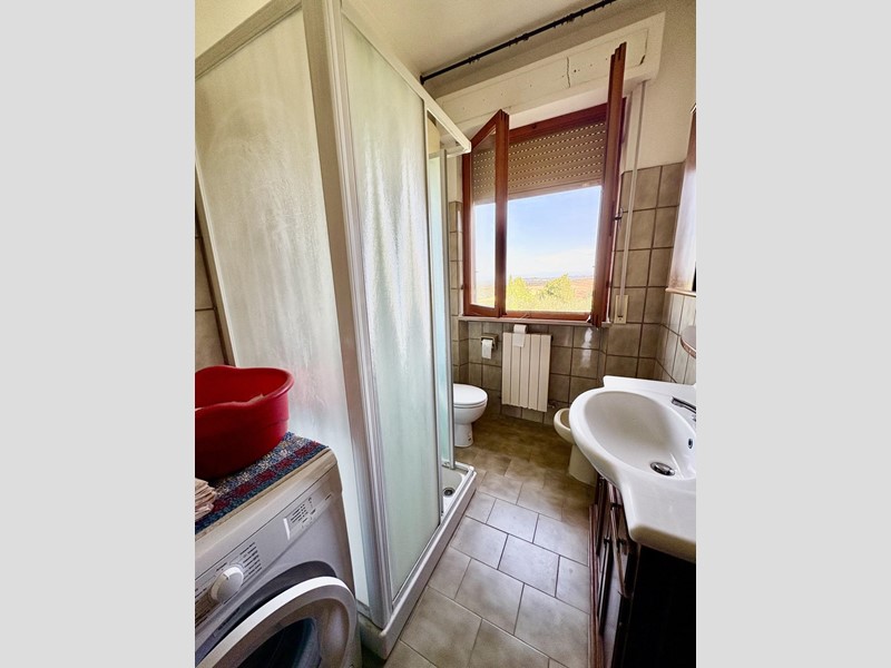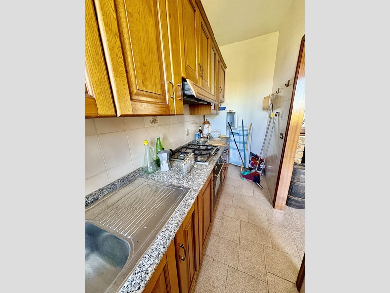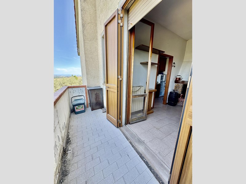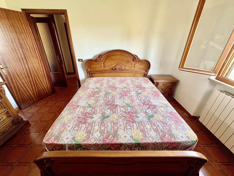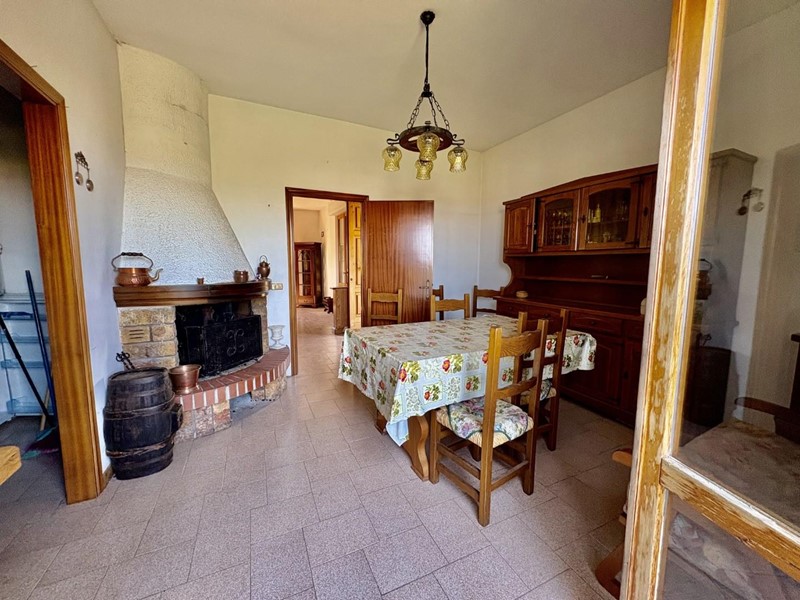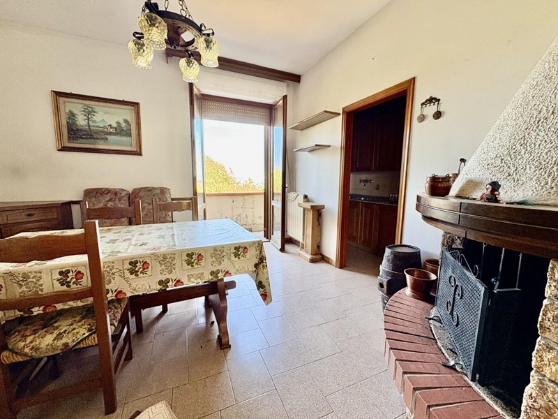 Attraverso una scala esterna si accede al primo piano, dove si apre un ampio terrazzo coperto e vivibile, che permette di godere di un’ampia vista sulla campagna circostante. Entrando nell’appartamento, si viene accolti da una zona soggiorno collegata alla sala da pranzo, anch’essa con camino, creando un’atmosfera calda e accogliente. Il cucinotto, separato, completa gli spazi di vita quotidiana. Tramite un disimpegno si accede alla zona notte, composta da due camere matrimoniali e un bagno finestrato, offrendo comfort e praticità.