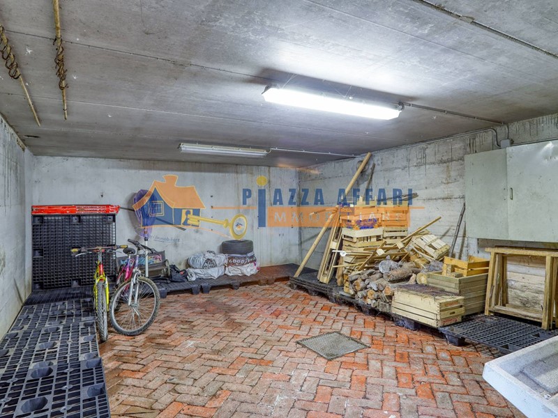 Allesterno, uno spazio comune pavimentato accoglie un box doppio con basculante motorizzata oltre una sottostante grande cantina.