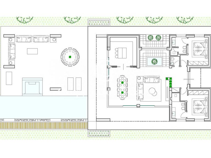 Al piano terra si trovano una luminosa zona giorno con cucina abitabile, due camere matrimoniali con bagno en suite e un bagno ospiti. Al primo piano, una camera padronale con ampio bagno privato.