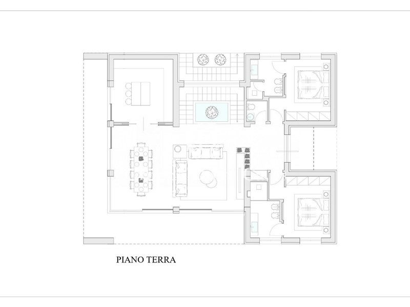 Al piano terra, un elegante ingresso conduce in un’ampia zona giorno dove grandi vetrate illuminano gli ambienti e creano una continuità visiva con il giardino. Il salone e la sala da pranzo si fondono in un unico spazio conviviale, arricchito da una cucina abitabile perfettamente attrezzata. Sullo stesso piano si trovano due camere matrimoniali, entrambe con bagno privato, oltre a un bagno di servizio per gli ospiti. Dal soggiorno si accede direttamente al portico esterno, ideale per pranzi all’aperto o momenti di relax con vista sulla piscina.