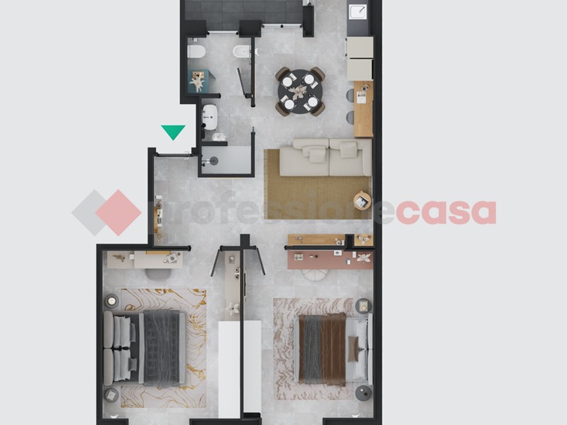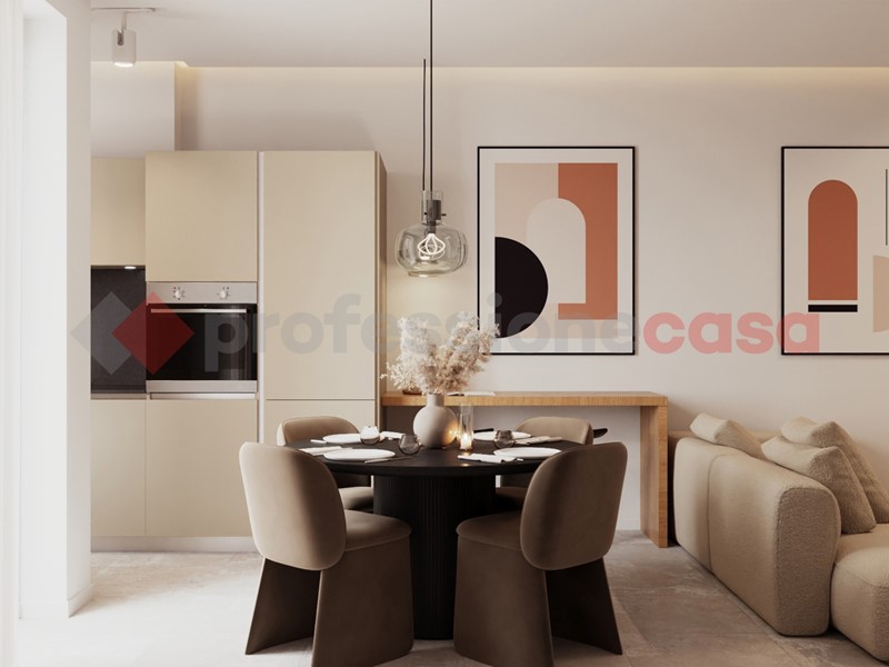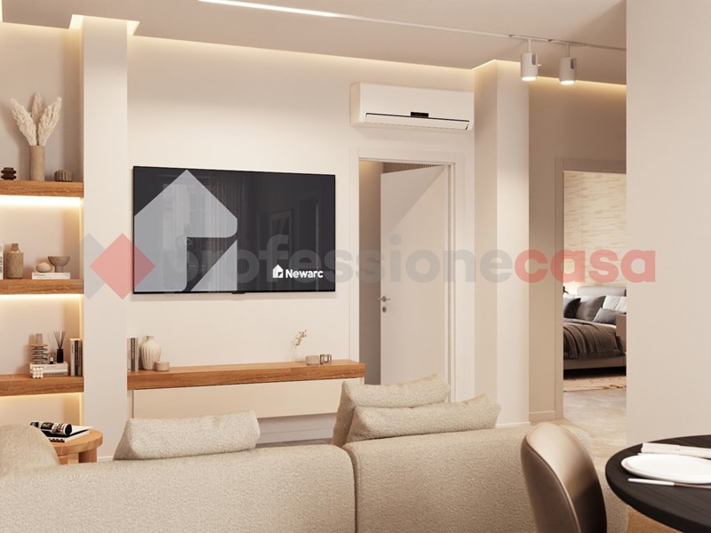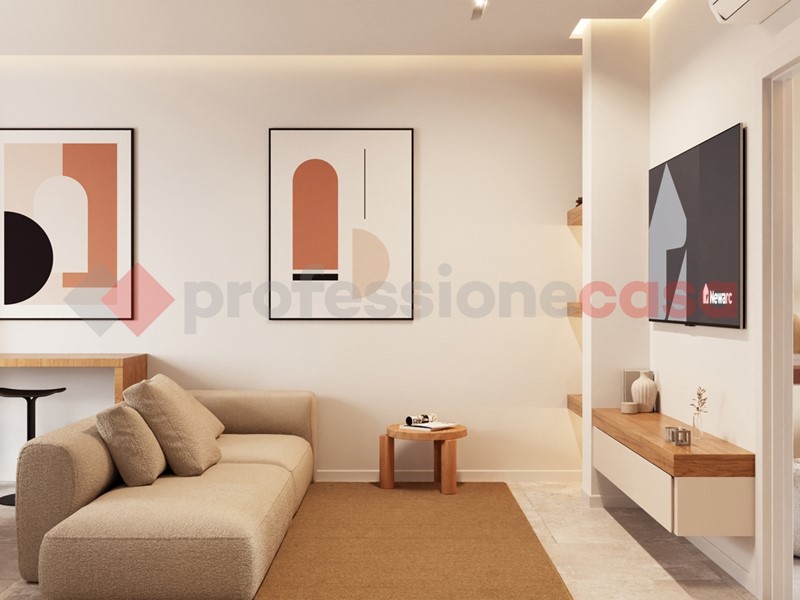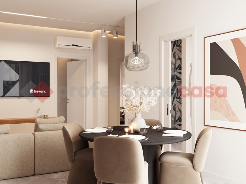 Composto da ingresso living su soggiorno con cucina a vista, 2 ampie camere e servizi igienici, ampio balcone esposto a est e piccolo terrazzino esposto ad ovest accessibile dalla zona giorno.