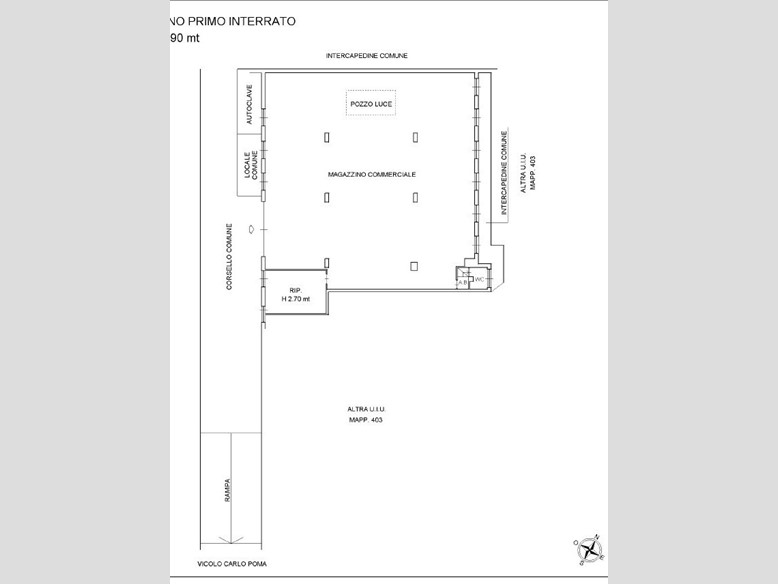 L'immobile è posto al piano primo interrato, a parte di un ottimo contesto condominiale degli anni Settanta, è dotato di ingresso carraio indipendente dallo stabile, in condivisione con un'altra unità.