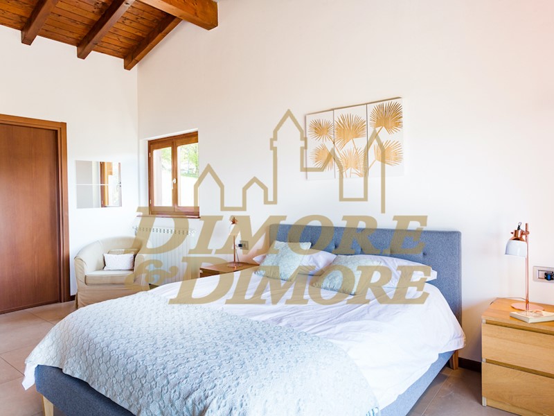 Raffinata camera padronale con travi in legno a vista e doppia esposizione.