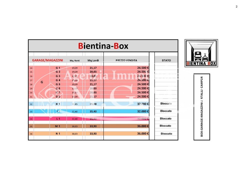 L’intervento, UNICO NEL SUO GENERE, commercializzato dall’Agenzia IMMOBILIARE M.G.M. di Bientina & Agenzia LOTTI e Realizzato dalla ditta FOSSETTI COSTRUZIONI srl, prevede la conversione dell’Ex-OFFICINE POGGETTI, situata nel CENTRO del paese di BIENTINA, (a soli 260 ml dalla piazza principale), angolo Via Vittorio Veneto ( a senso unico) e Via Galileo Galilei ( doppio senso), in un complesso adibito, BOX, GARAGE, MAGAZZINI di varie dimensioni destinati al parcheggio di Veicoli ( AUTO – FURGONI - CAMPER – BARCHE – MOTO, ecc) o DEPOSITO materiale e/o magazzino per negozi/attività in genere. Vietato l’uso professionale come laboratorio (NO - LABORATORIO). Saranno presenti anche ampi STALLI privati ESTERNI per PARCHEGGIO CAMPER, dotati di servizi;
