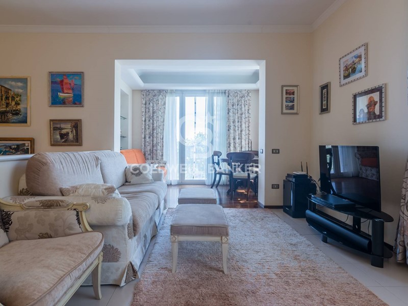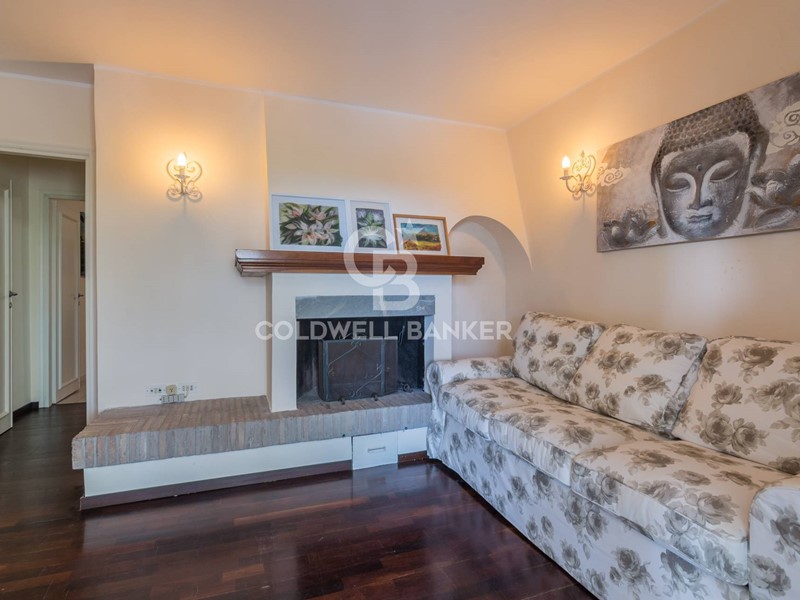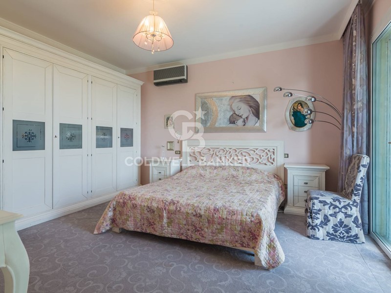Dal soggiorno si accede al piano inferiore, dove troviamo un salottino con camino, due camere da letto, bagno, ampia terrazza parzialmente loggiata, con suggestiva vista mare, dalla quale si accede alla piscina.