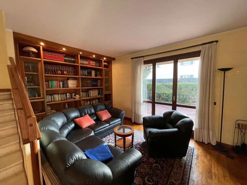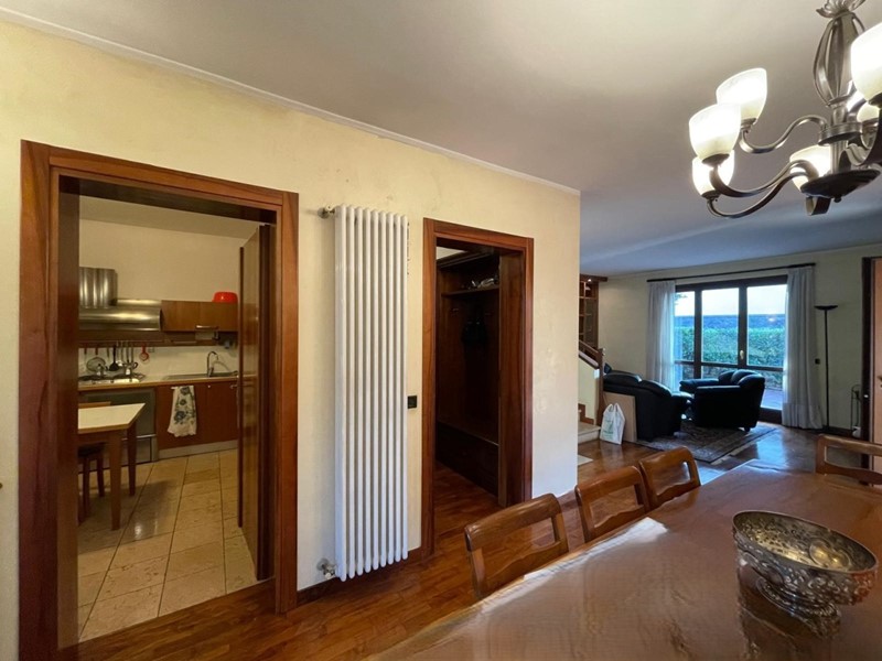 L’ingresso accoglie in una luminosissima zona living con camino e parete attrezzata, affiancata da un’area pranzo e da una cucina abitabile. Completa il livello un bagno di servizio.