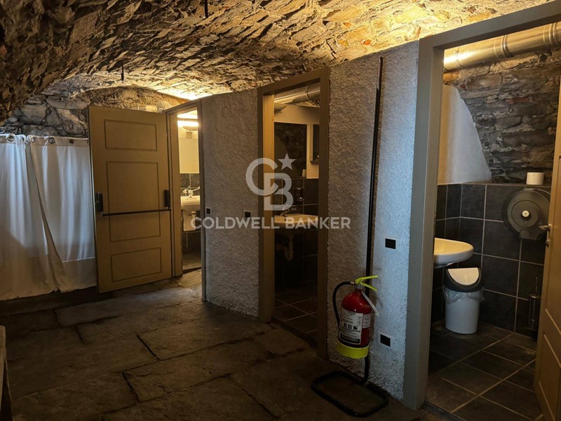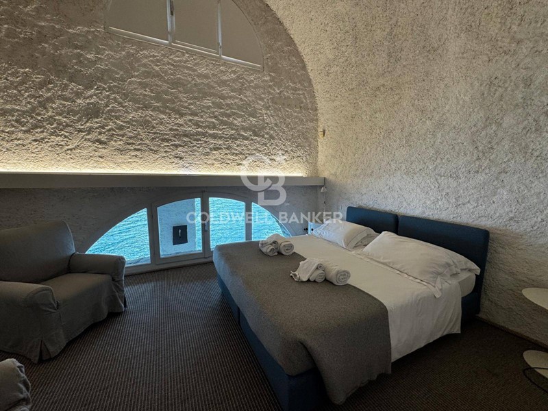Piano terra: accoglie una cucina con zona colazione, una sala da pranzo, un bagno, un doppio soggiorno con camino, una taverna con grande camino in pietra, ambienti di servizio, un bagno e un suggestivo porticato in pietra che percorre lintera facciata sul lago. Questo spazio esterno consente laccesso diretto al lago tramite un pontile privato.