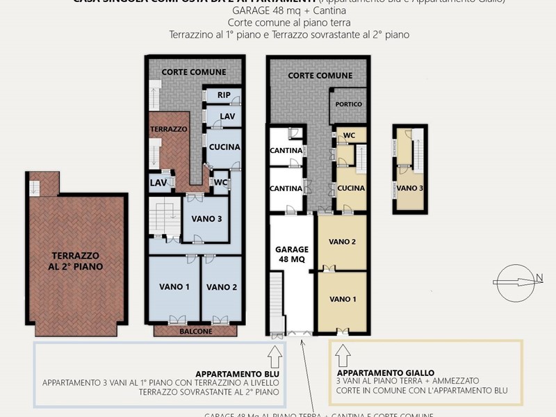 - AL CENTRO (tra i 2 appartamenti), con ingresso autonomo sempre su strada, troviamo il GARAGE da 48 mq con cantina.