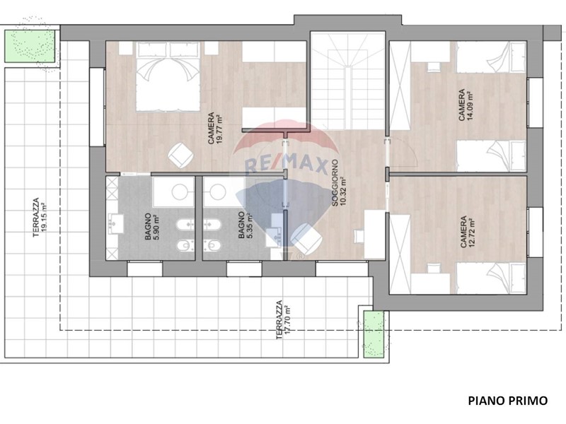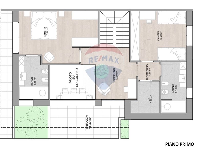 Al piano superiore si sviluppa la zona notte, composta da due camere da letto una delle quali con accesso diretto a un grande terrazzo, due bagni, ripostiglio ed un angolo hobby che può essere destinato a studio, area relax o giochi. È inoltre possibile la realizzazione di una quarta camera, grazie alla flessibilità degli spazi.