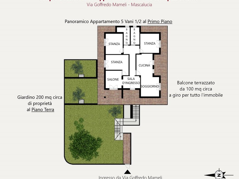 Mascalucia zona residenziale, su Via Goffredo Mameli, traversa di Via Alcide de Gasperi a 700 metri dal centro, proponiamo in vendita Panoramico Appartamento in Villa 5 Vani 1/2 Vista Mare, da 140 mq circa, unico appartamento al 1° piano con 4 esposizioni libere e ampio balcone terrazzato a giro per tutto l'immobile da circa 100 mq, oltre a giardino di proprietà al piano terra da circa 200 mq. Splendida soluzione dagli ampi spazi interni ed esterni, in piccolo contesto tranquillo e silenzioso a pochissima distanza dal centro paese, che offre numerose possibilità di personalizzazione: è' possibile infatti mantenere il taglio attuale oppure ricavare fino a 4 camere da letto (per famiglie numerose), dividerlo in 2 appartamenti più piccoli, o utilizzarlo per uso studio e abitazione insieme.