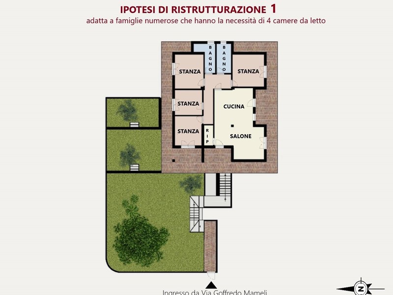ipotesi 1: adatta a famiglie numerose che hanno la necessità di 4 camere da letto