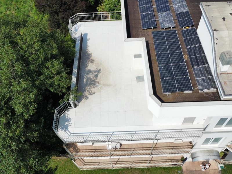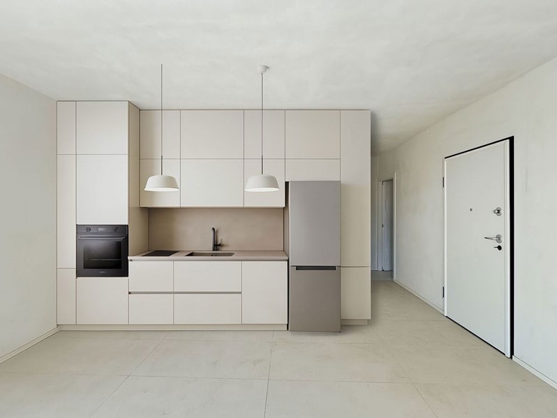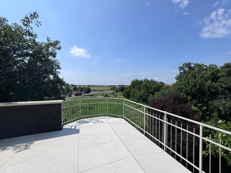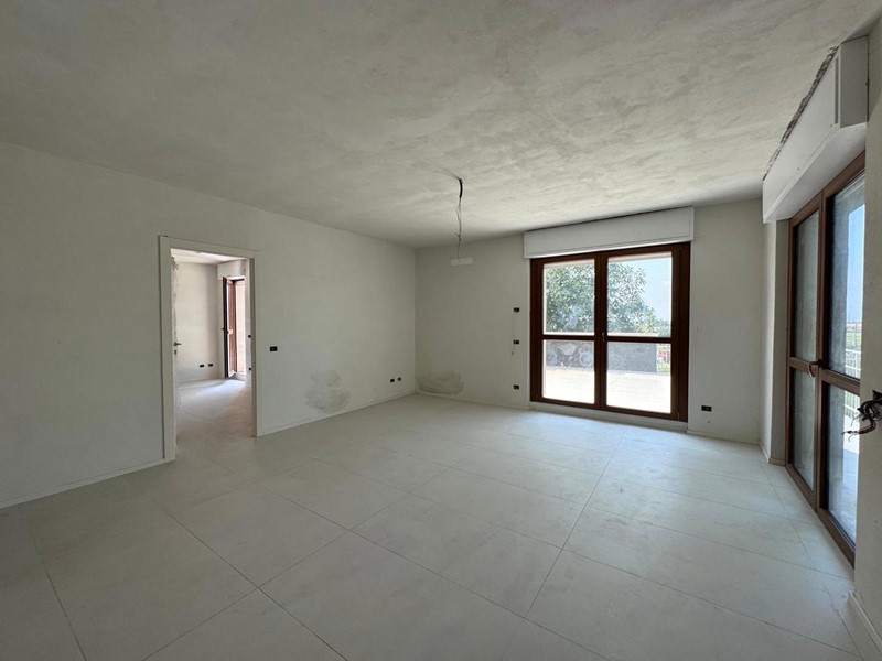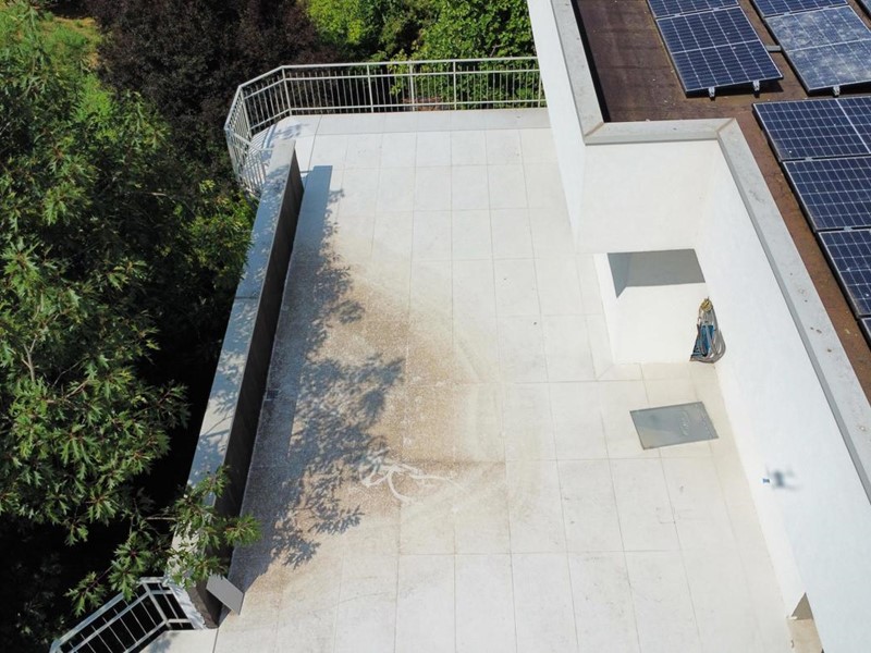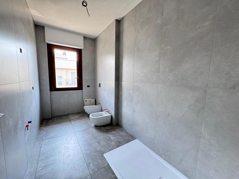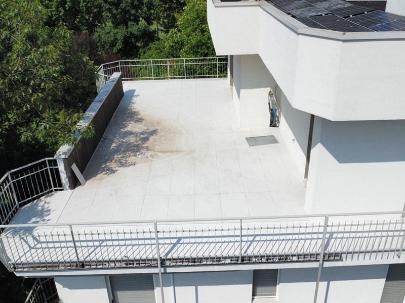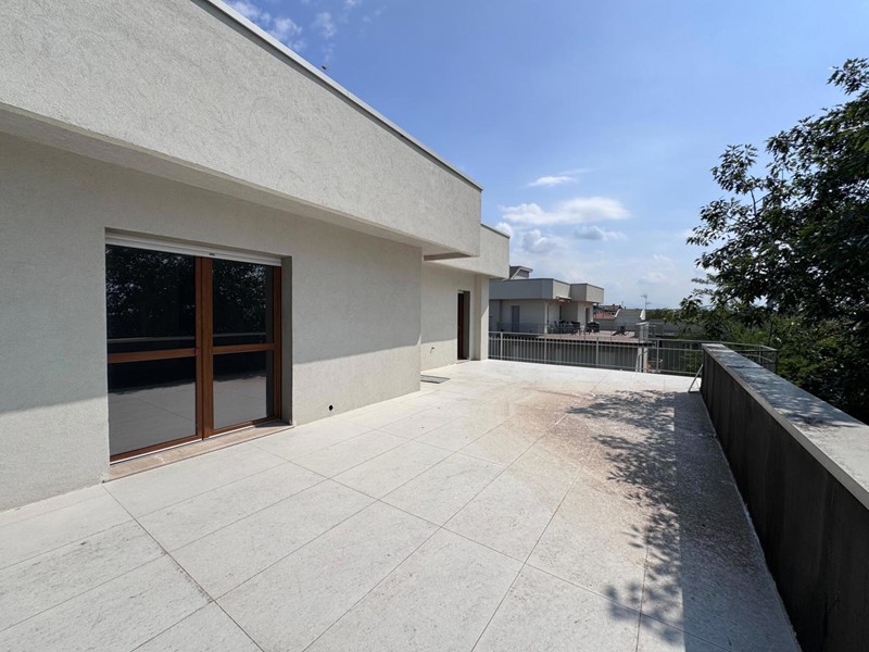 La porta blindata d'ingresso ci permette di accedere ad un' ampia e luminosa zona giorno con cucina a vista e accesso diretto al terrazzo di 90mq esclusivo esposto a sud e sviluppato sui 3 lati dell'immobile.