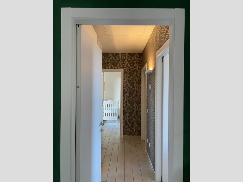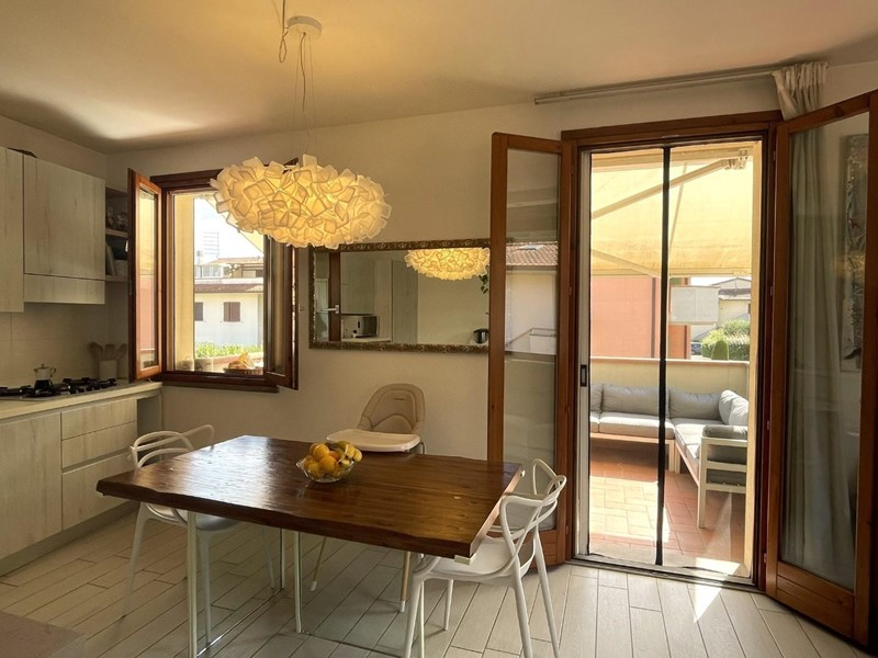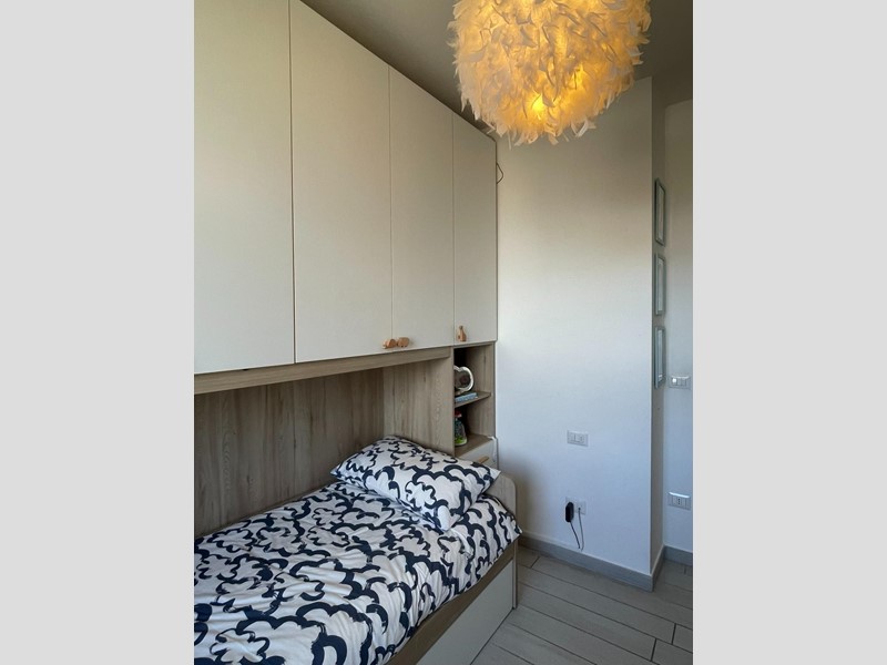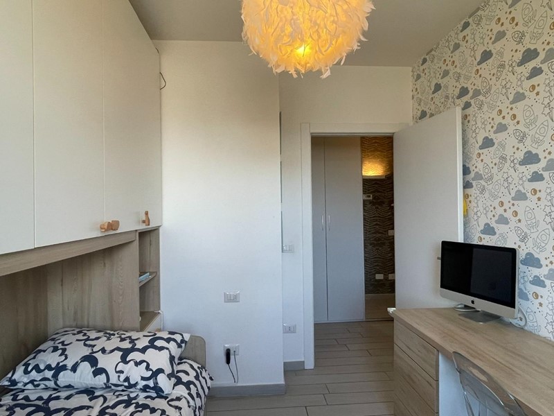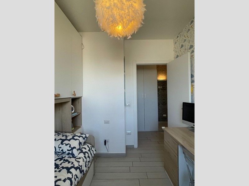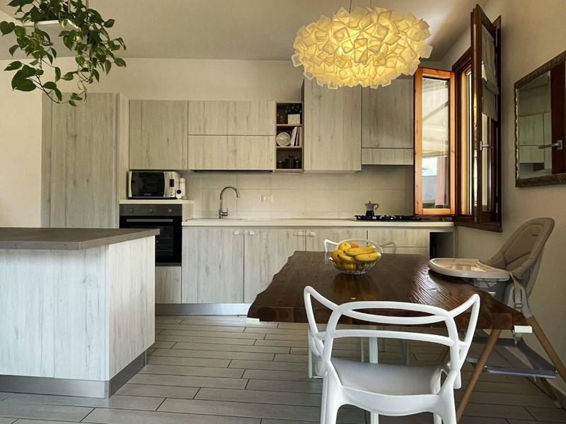 L'appartamento è composto da una spaziosa zona giorno con ingresso, soggiorno, cucina e sala da pranzo. Questo ambiente si affaccia sull'ampia terrazza, dando continuità all'aperto al living della casa. La zona notte comprende una camera matrimoniale con terrazzo, una cameretta e un bagno con doccia. Al piano terra, collegata al garage, si trova una pratica lavanderia.