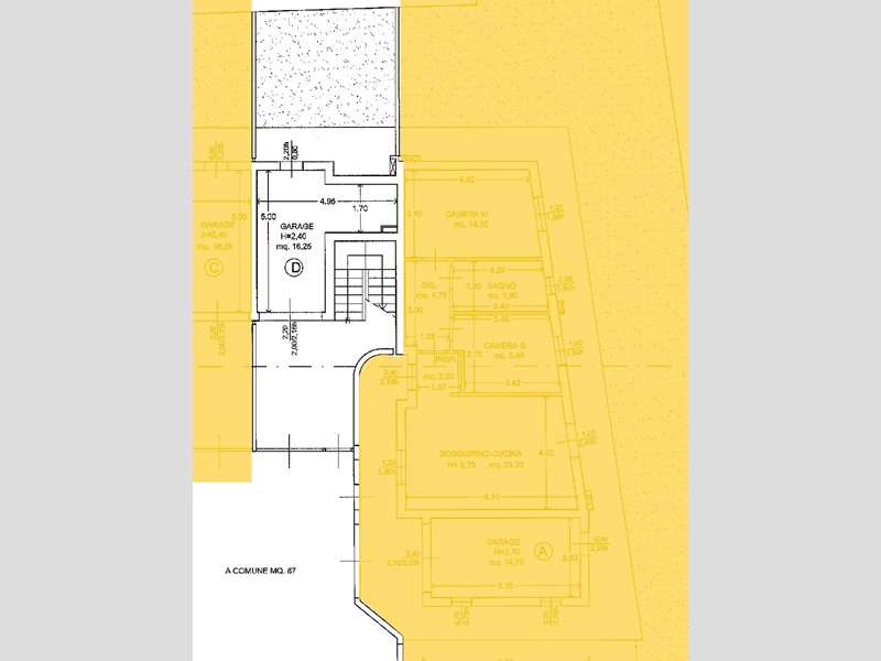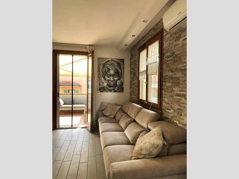 Si accede all'abitazione da scala esterna e terrazzo, attraverso una corte esclusiva che immette anche nel garage privato di oltre 15 mq. La proprietà include anche un piccolo giardino di circa 27 mq sul retro del garage.
