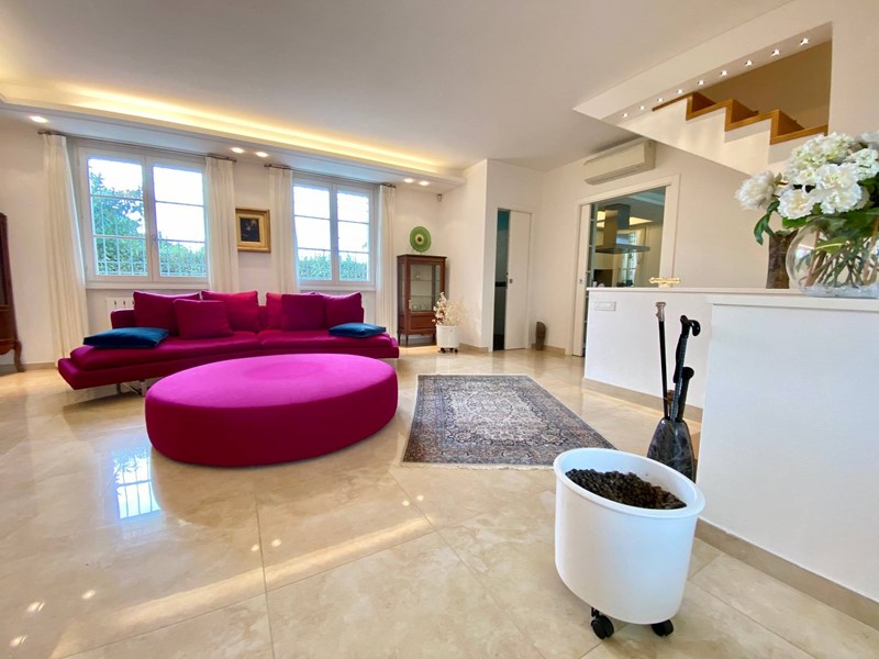 La villa si sviluppa su due livelli fuori terra oltre il piano seminterrato con un giardino privato di circa 900 mq.