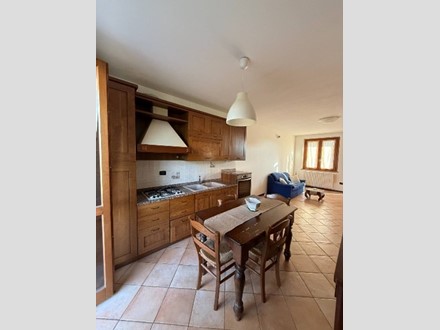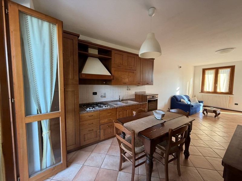 L'immobile è parzialmente arredato, con cucina a vista e balcone che offre una piacevole vista sul verde circontante.
