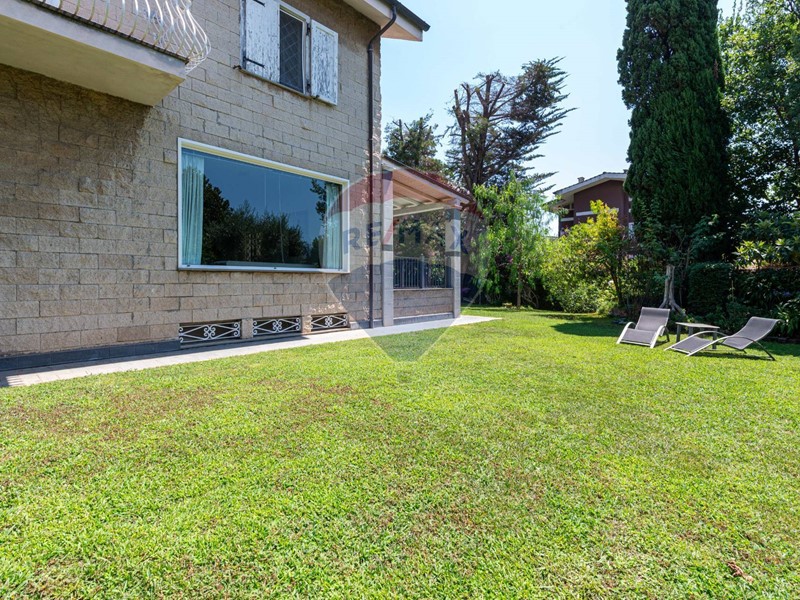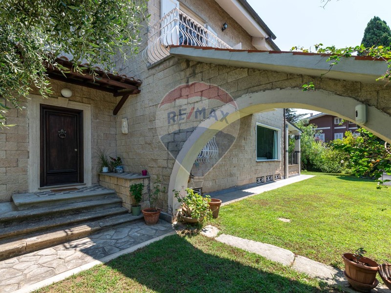 La villa, libera su quattro lati e interamente rivestita in pregiato travertino, è immersa in un giardino privato di circa 900 mq, uno spazio esterno curato e silenzioso, ideale per godere della natura e della privacy in ogni stagione.