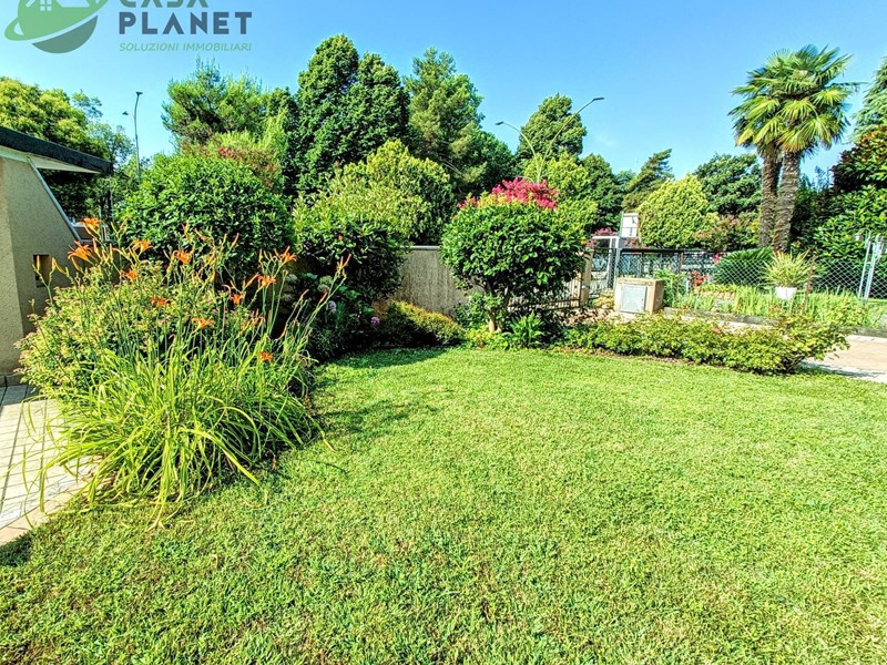 Il giardino, ben curato e piantumato è dotato di irrigazione automatica e gode di una zona piastrellata utile come posto auto.