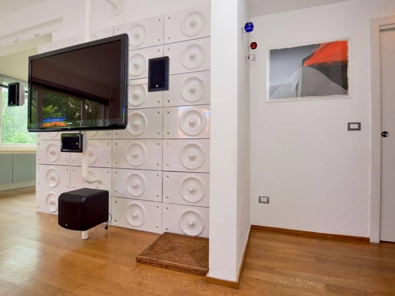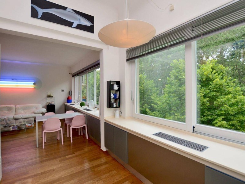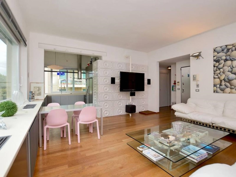 Sviluppato su di una superficie di circa 130 mq e servito da ascensore, l'appartamento si compone di ingresso nel grande e luminoso open space a giorno, con vista, tramite la panoramica vetrata a tutta parete, sulla pineta di Viareggio e sulle Alpi Apuane. L'appartamento risulta suddiviso in due zone ben distinte: il soggiorno e la zona pranzo con attigua attrezzatissima cucina.