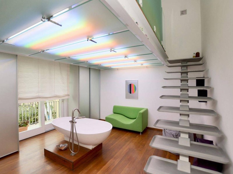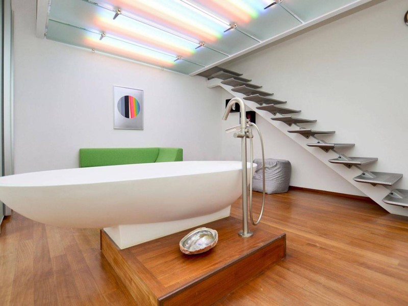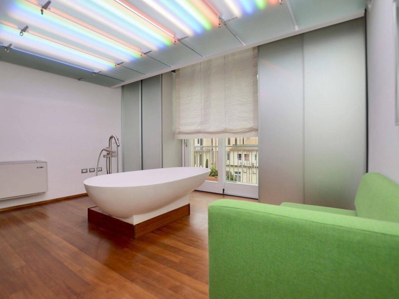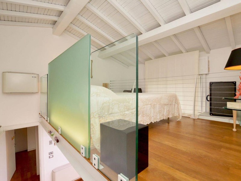 La camera padronale risulta strutturata su due livelli, al livello più basso trovano collocazione uno spazio armadi, un divano ed una vasca da bagno freestanding, posta al centro del locale, uno spazio rilassante per la coppia completo di impianto luci con cromoterapia. Il letto matrimoniale si trova sul soprastante soppalco collegato al livello sottostante tramite la bella scala di desing in ghisa.