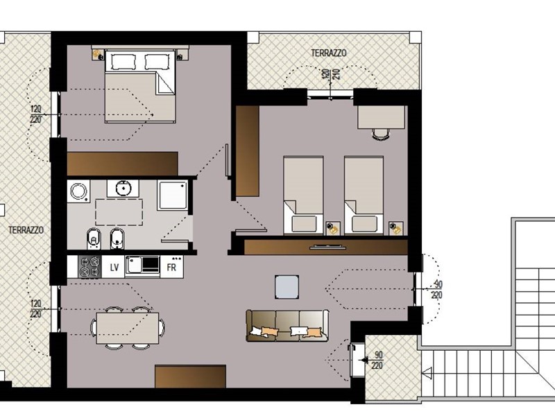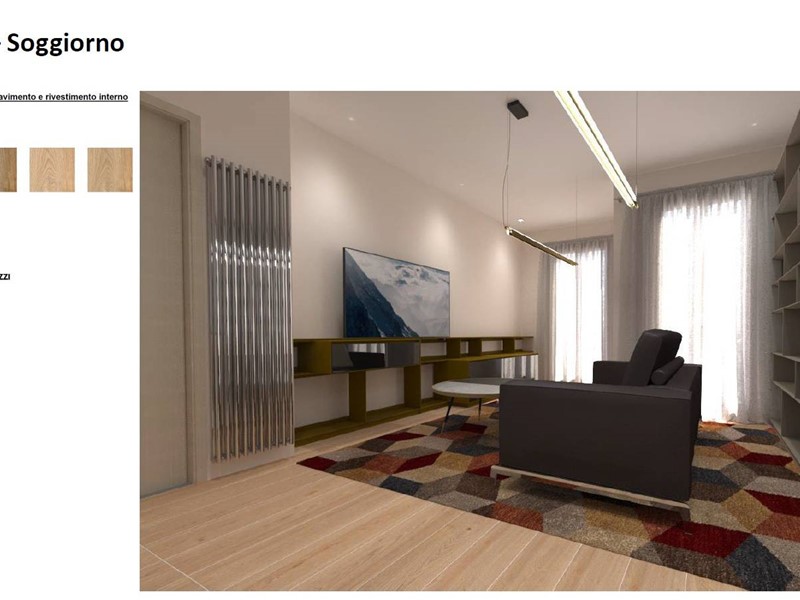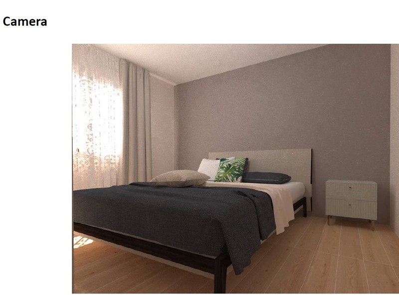 L'appartamento di 80 mq commerciali internamente è composto da un grande soggiorno con cucina a vista, due camere matrimoniali, bagno con vasistas e due grandi terrazzi.