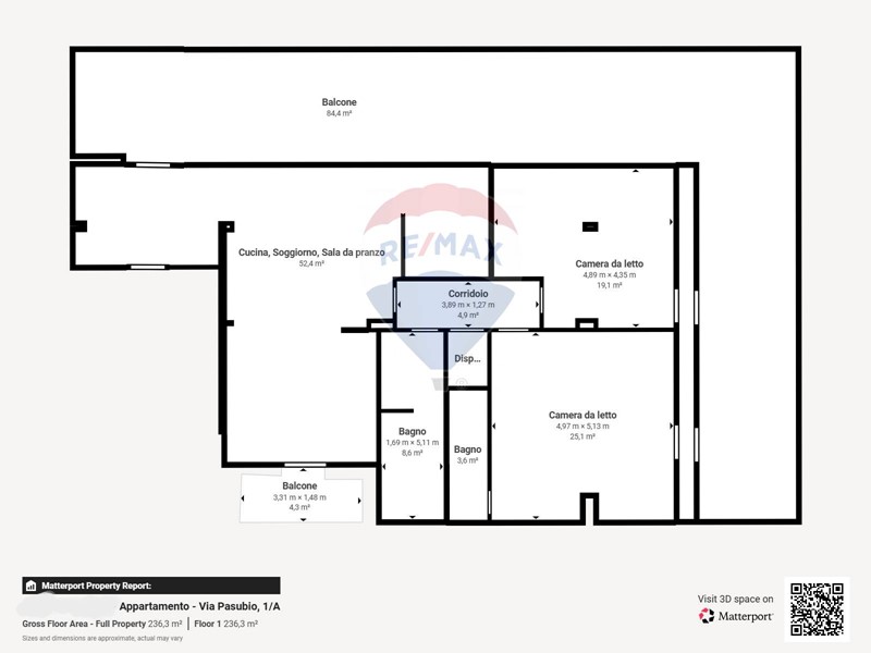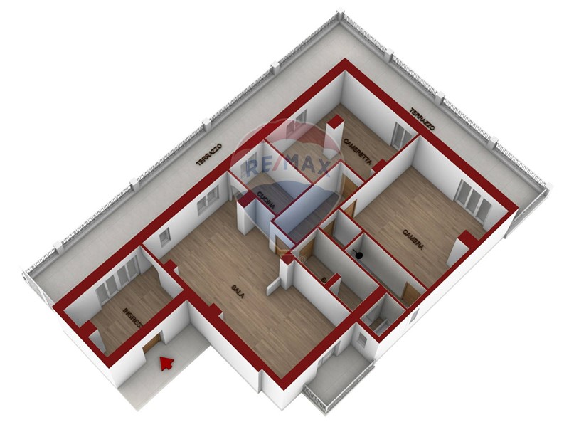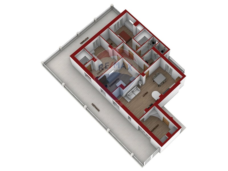 Varcando la soglia ci accoglie un grande ingresso con vista sul terrazzo che disimpegna la zona living con doppia esposizione, questa potrebbe accogliere la cucina open space benché c'è una cucina adiacente che volendo potrebbe prendere la forma di un' altra camera o di uno studio, adiacente alla zona soggiorno living troviamo il primo bagno, a seguire un piccolo vano organizer a servizio sia della zona giorno che della zona notte, ci accoglie subito dopo l'ampia camera padronale con bagno dedicato che permette per le dimensioni e la forma di creare un comodo vestiaire- cabina armadio, un'ultima camera con due punti luce, molto spaziosa può essere sia una cameretta doppia, o può essere divisa.