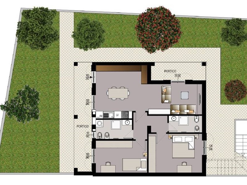 L'appartamento di 100 mq commerciali internamente è composto da un grande soggiorno con cucina a vista, due camere matrimoniali, due bagni, due grandi porticati e giardino privato.