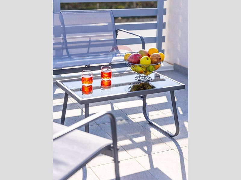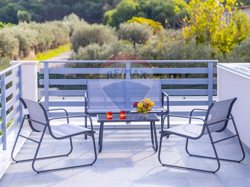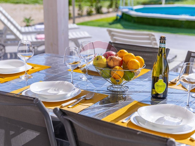 L'esterno della proprietà, fornita di una cisterna per la riserva idrica, gode di un'ampia area verde di circa 3000 mq e si inserisce armonicamente nella cornice del paesaggio circostante.