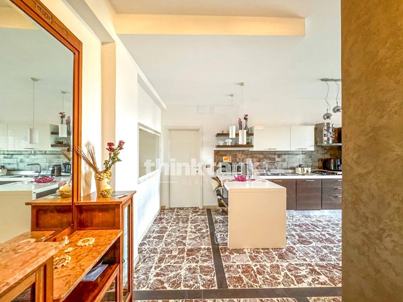 Ingresso su ampia cucina-soggiorno open-space con elegante penisola, ideale per vivere momenti conviviali
