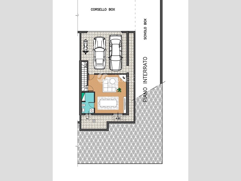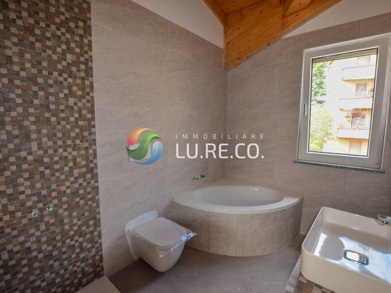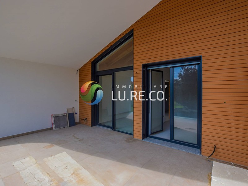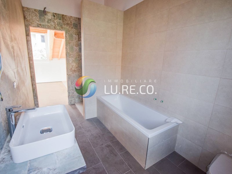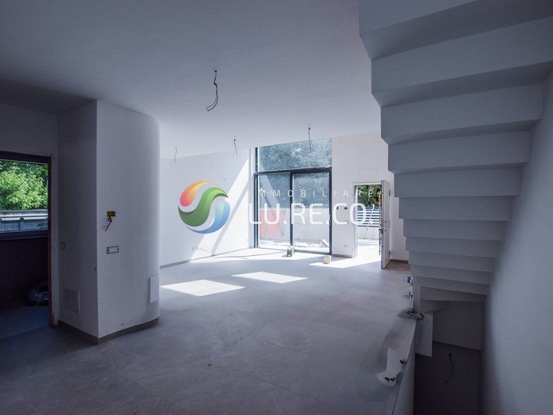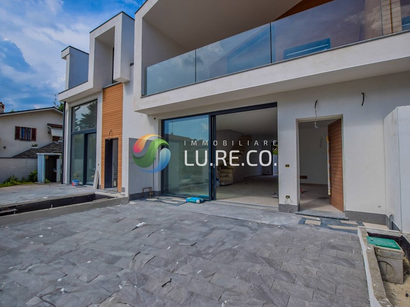 La soluzione è suddivisa su tre livelli abitativi: piano terra (composta da zona giorno, cucina abitabile, camera da letto, un bagno cieco e circa 130 mq di giardino privato), piano primo (composto da due camere da letto, bagno, ampio terrazzo coperto con parapetto in vetro) e il piano seminterrato (destinata ad autorimessa e taverna con possibilità di inserire in futuro un caminetto)