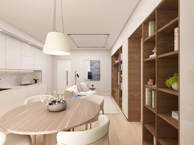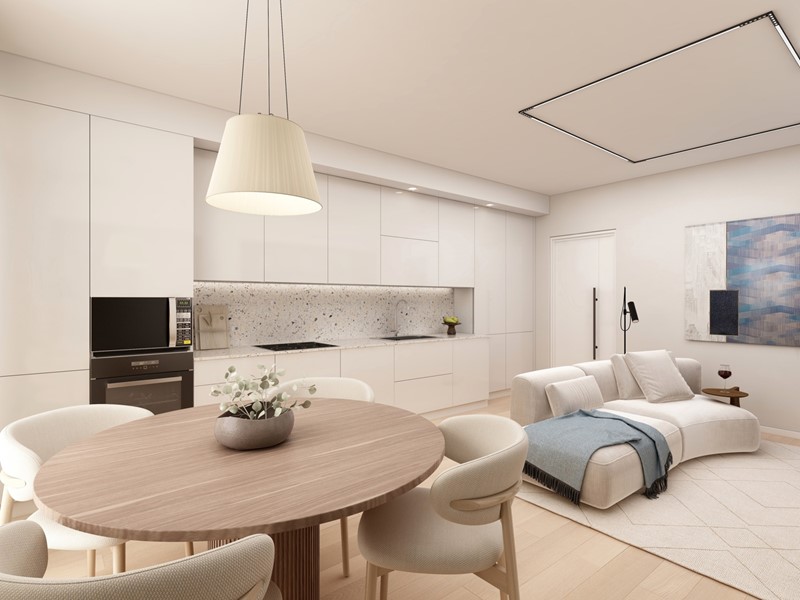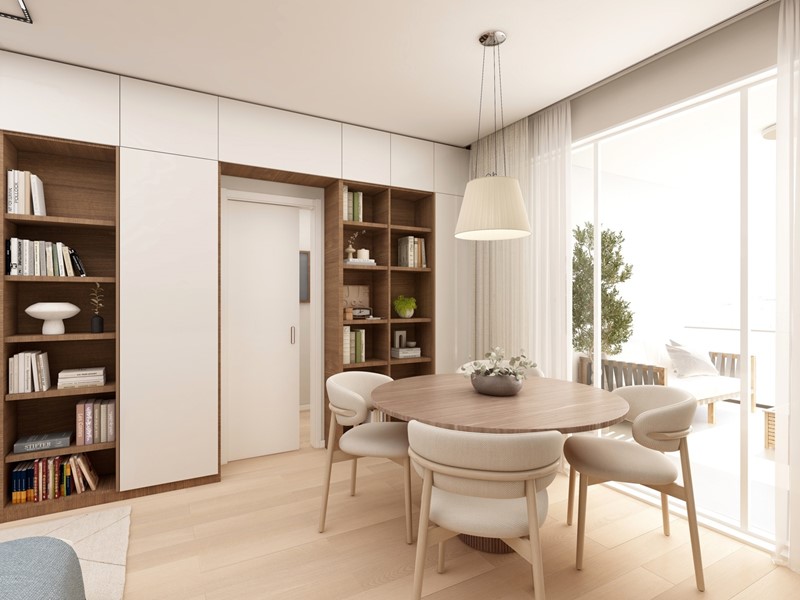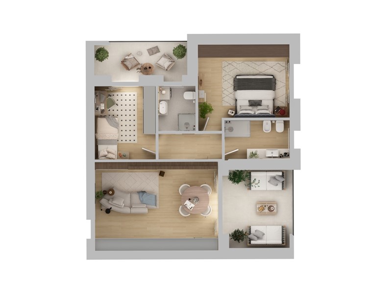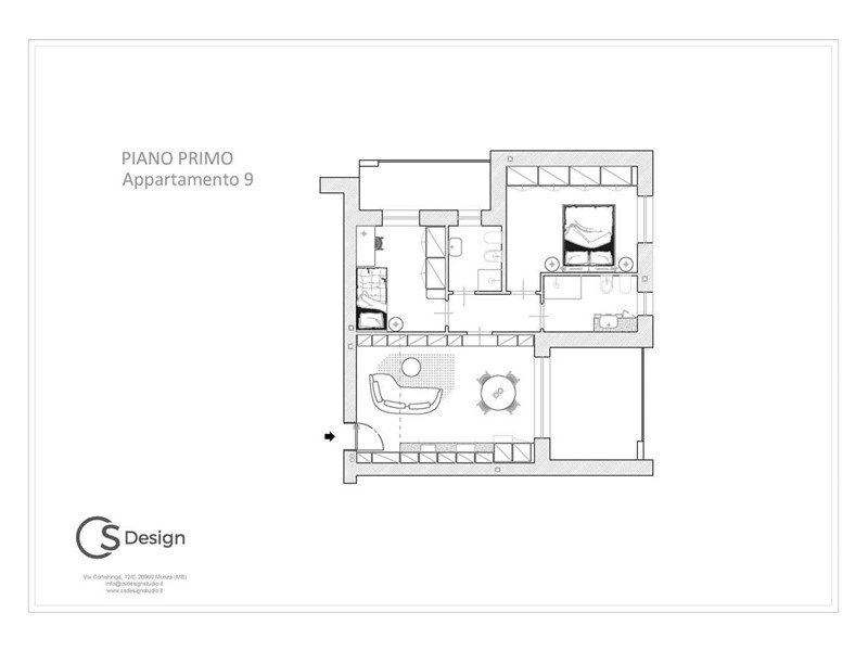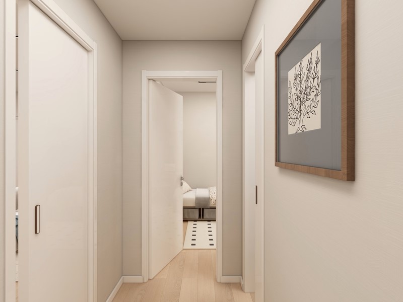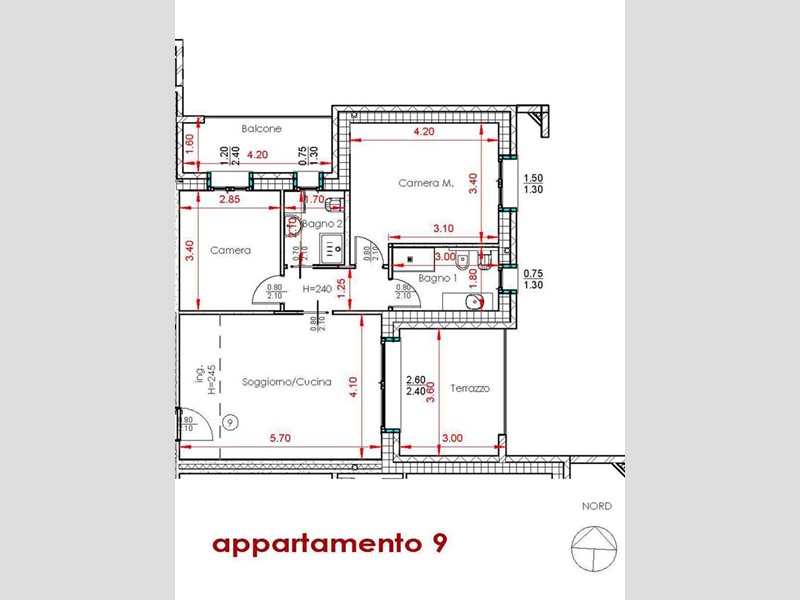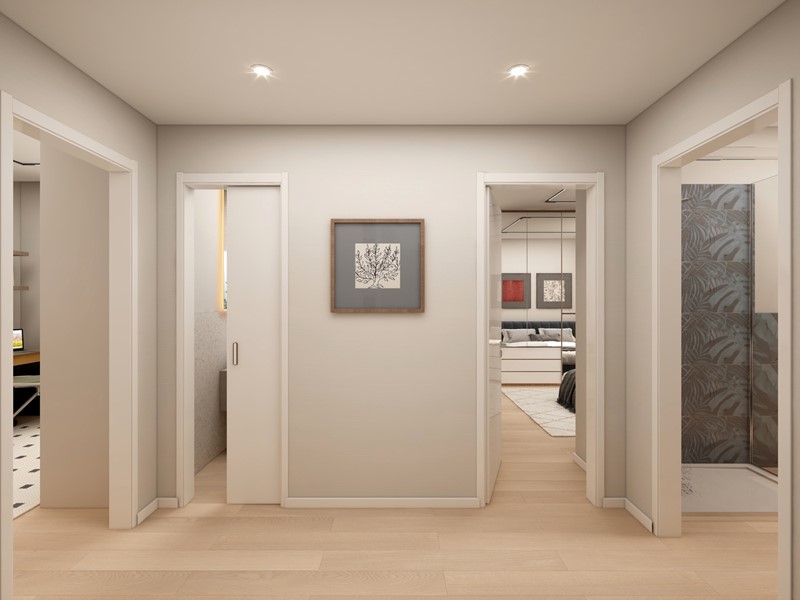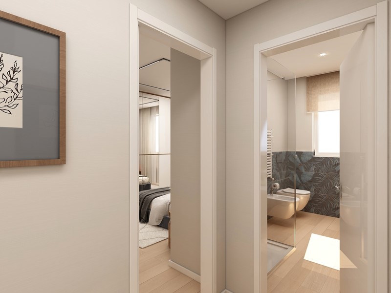 APPARTAMENTO 9: Tre locali, posto al primo piano - L'appartamento è composto da ingresso nella zona living servita da terrazzo loggiato di 17mq, disimpegno, due camere e doppi servizi oltre a secondo balcone.