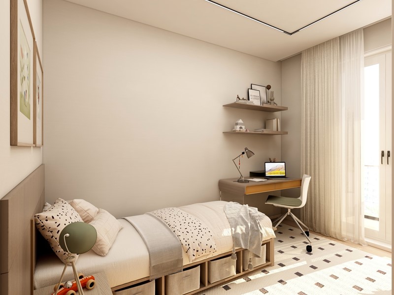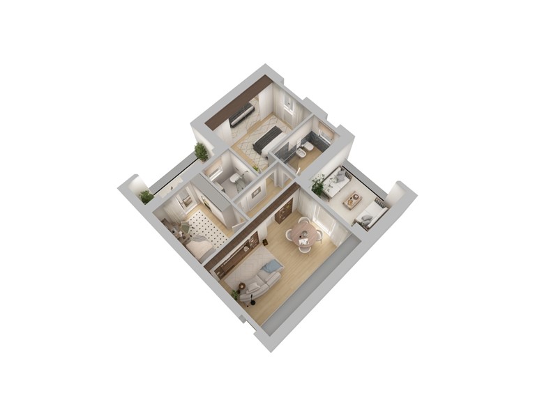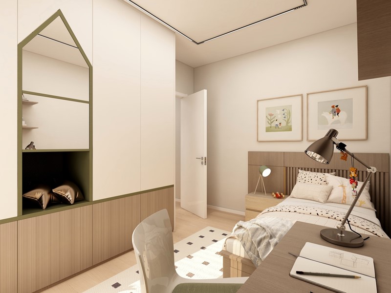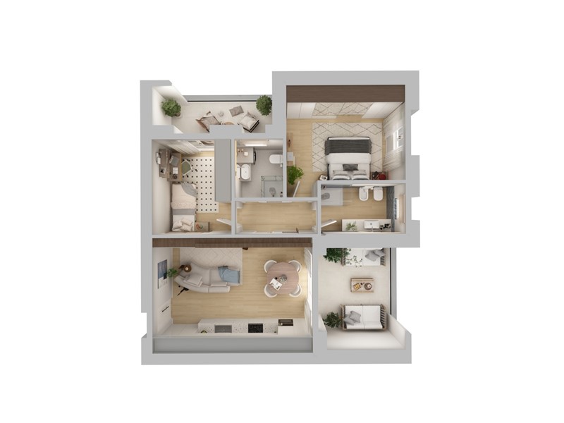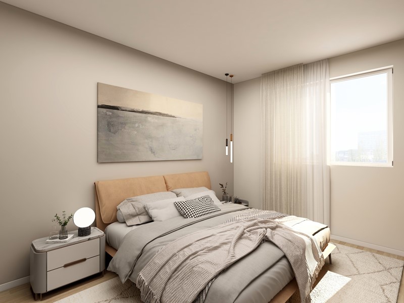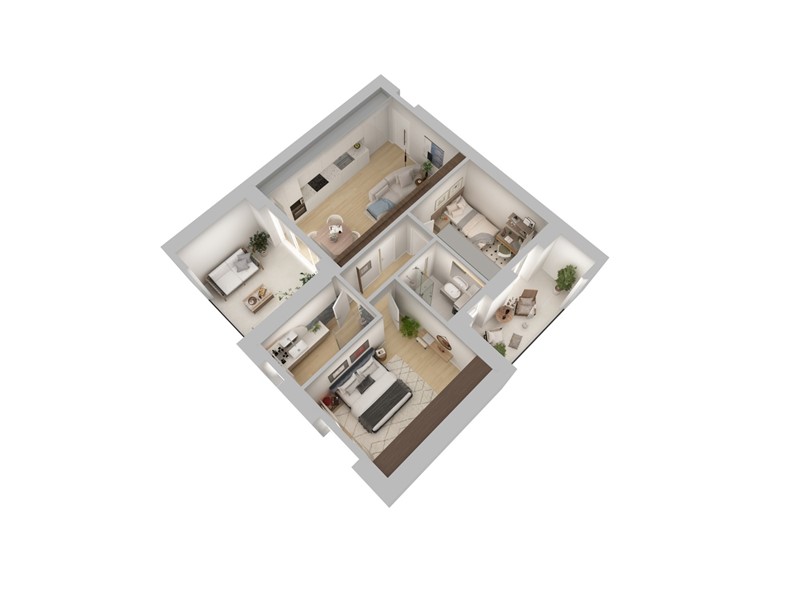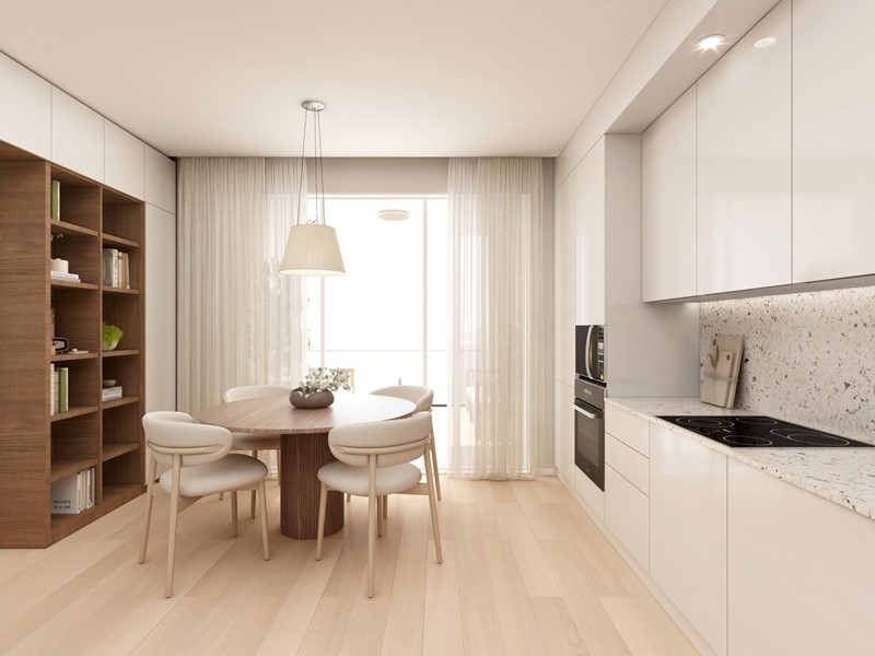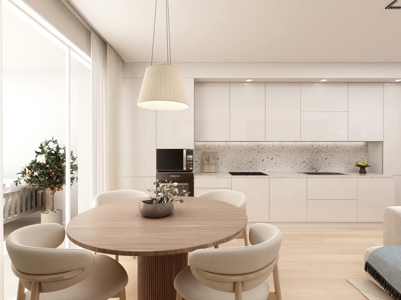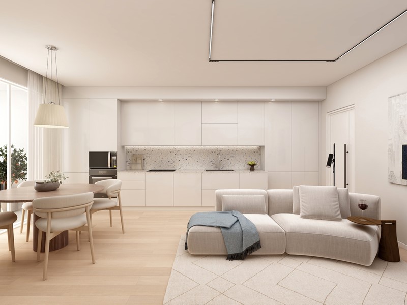 APPARTAMENTO 9: Tre locali, posto al primo piano - L'appartamento è composto da ingresso nella zona living servita da terrazzo loggiato di 17mq, disimpegno, due camere e doppi servizi oltre a secondo balcone.