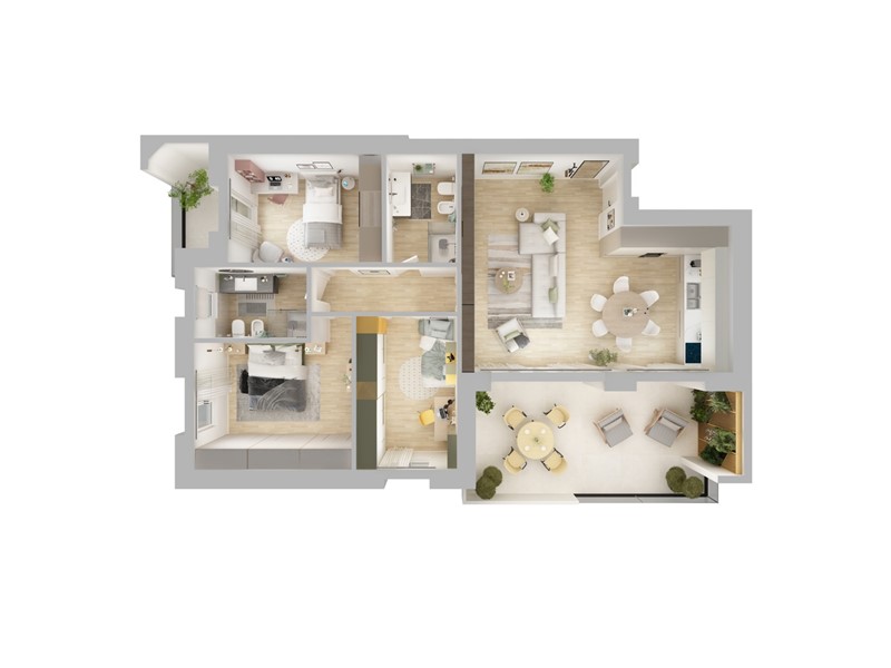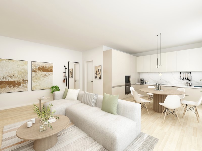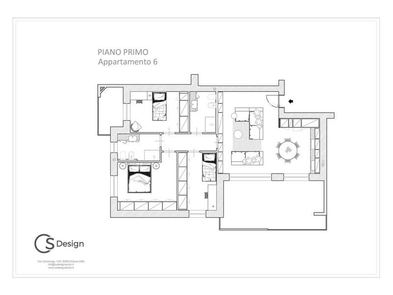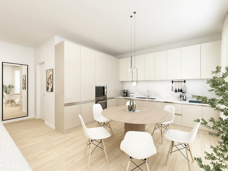 APPARTAMENTO 6: Quattro locali, posto al primo piano - L'appartamento è composto da luminoso soggiorno e cucina abitabile entrambi serviti da splendido terrazzo di 30 mq., il disimpegno conduce nella zona notte dove troviamo tre camere, doppi servizi e balcone.