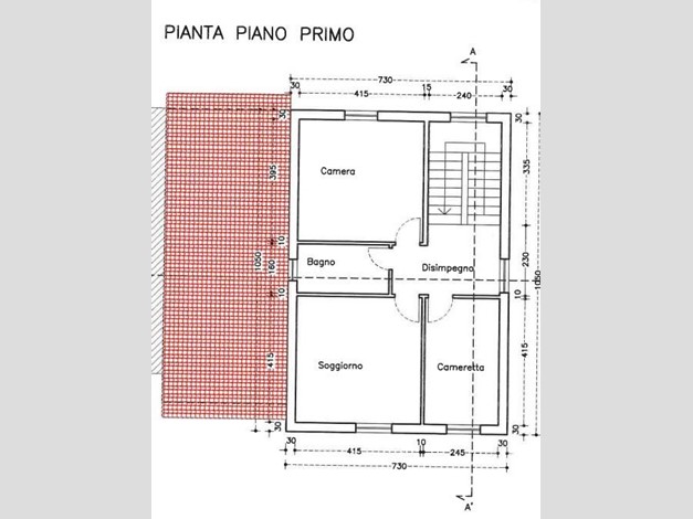 piano primo: disimpegno, due camere matrimoniali, cameretta e bagno.