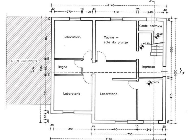 piano terra: ingresso, cucina, sala da pranzo, soggiorno e locale laboratorio oltre bagno.