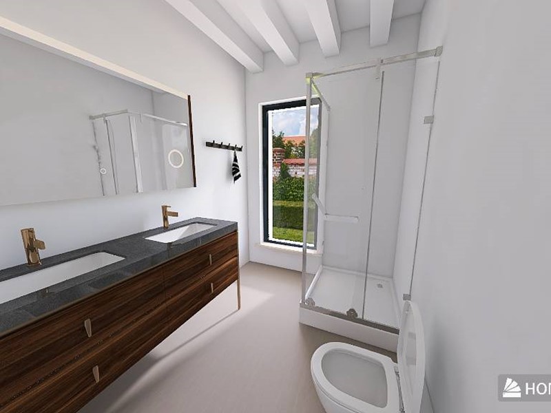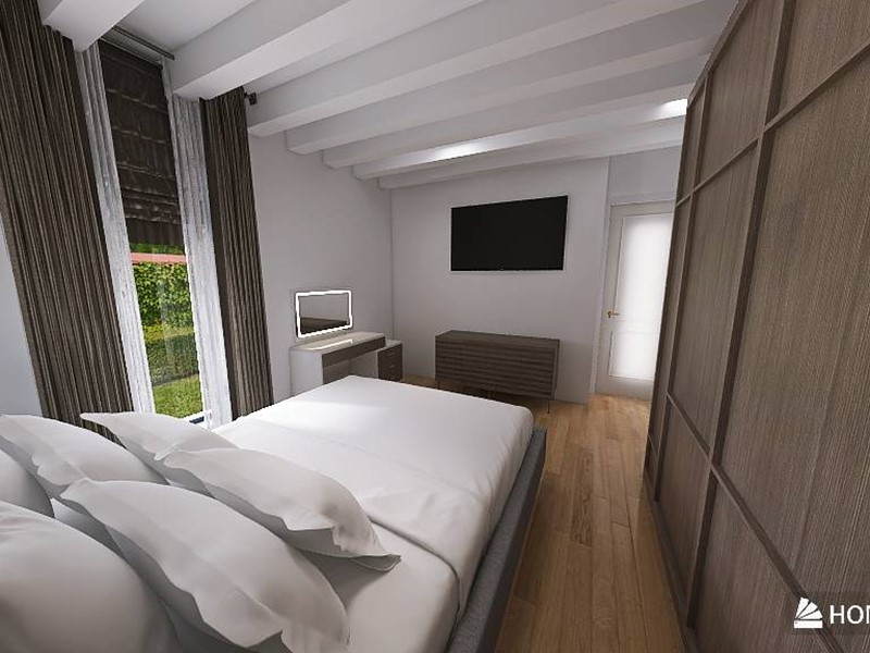 Sempre nello stesso piano troviamo una prima camera matrimoniale, pensata anche per chi ha necessità di non affrontare gradini nella quotidianità, di seguito un bagno con doccia ed un ulteriore vano jolly dove è posta la centrale dell'impianto idraulico, ma che è possibile utilizzare come lavanderia, stireria, ecc.