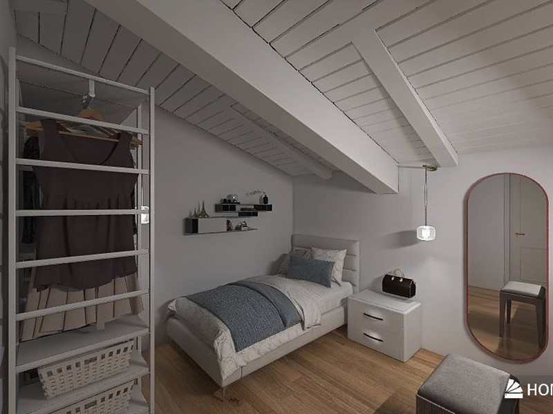 Salendo al piano superiore abbiamo una camera padronale di quasi 18 mq, servita da un bagno con vasca, altre due spaziose camere sempre doppie e un ulteriore bagno con doccia. Quasi tutto l'appartamento è rivestito con un pavimento in legno e travi a vista sbiancate, e dotato di infissi e impianti di alta qualità.