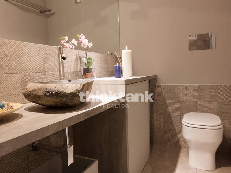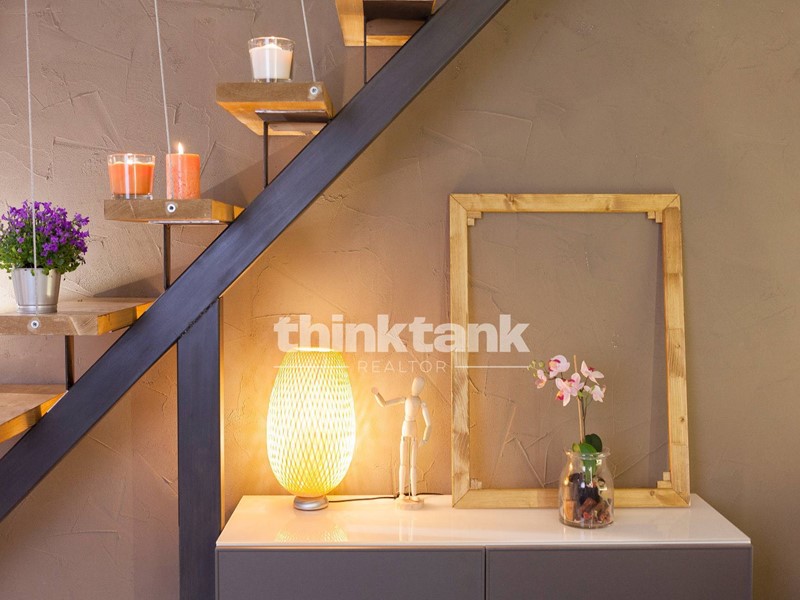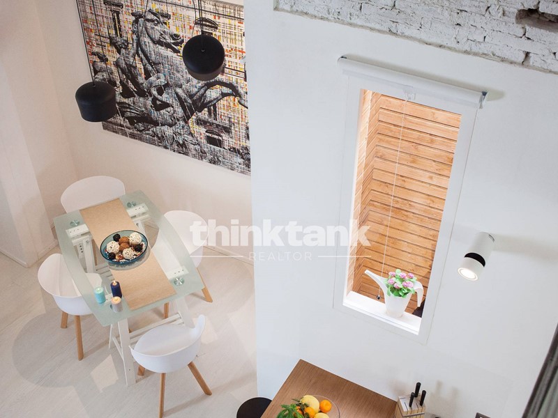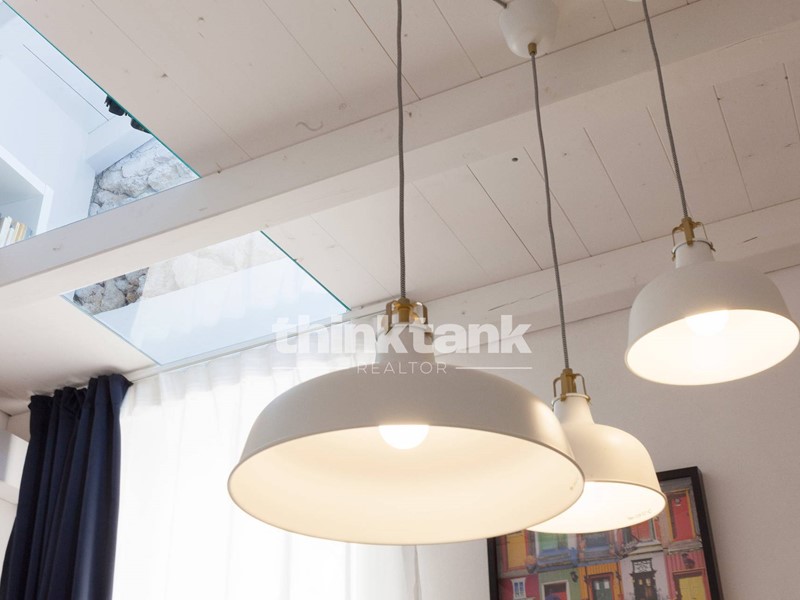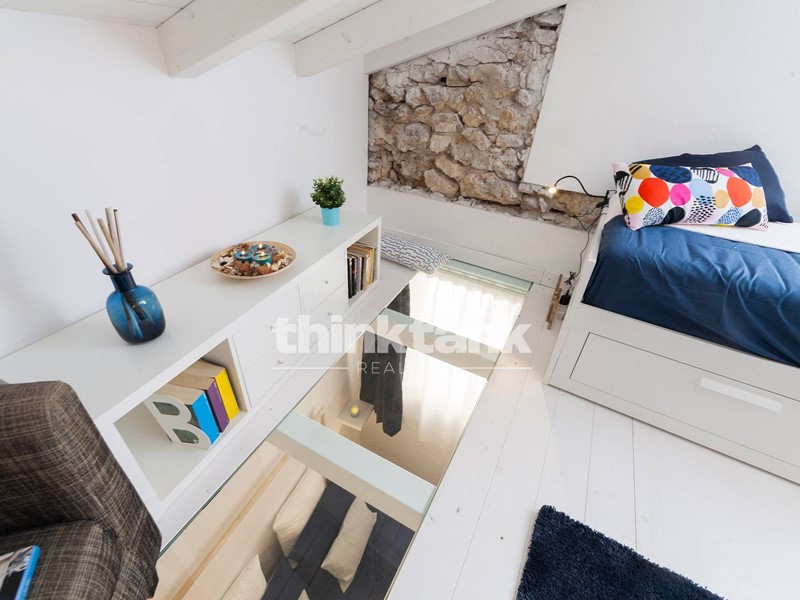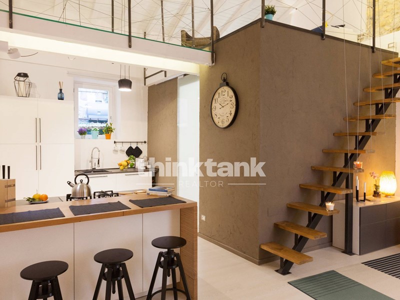 Unelegante scala in legno conduce al soppalco, dove si trova una seconda camera da letto, ideale per ospiti o come studio. A completare la proprietà, una scenografica scala in vetro dà accesso al secondo bagno.